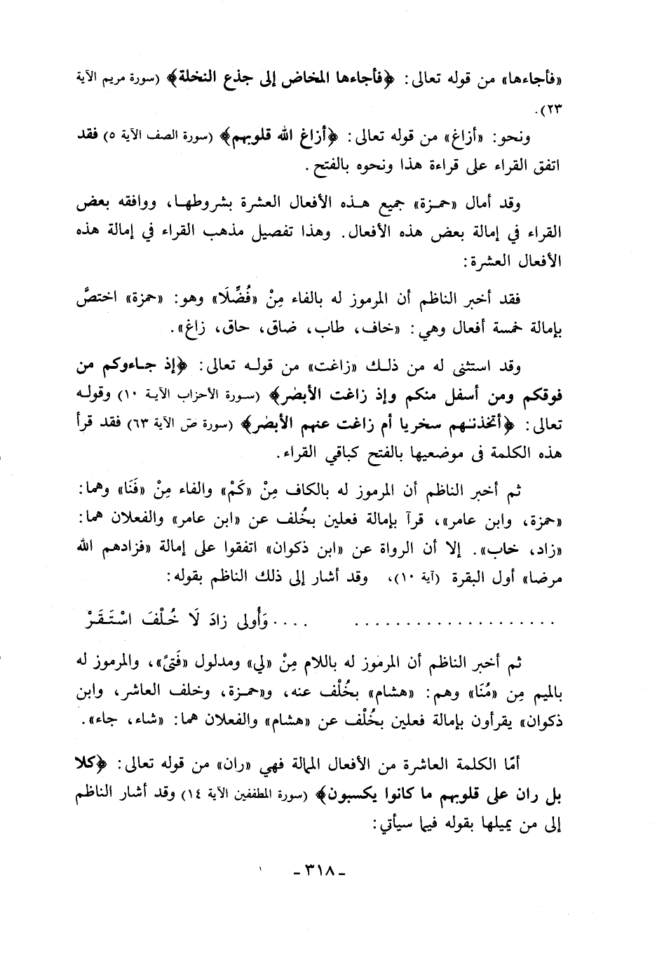 «زاد، خاب». إلا أن الرواة عن «ابن ذكوان» اتفقوا على إمالة «فزادهم الله مرضا» أول البقرة (آية 10)، وقد أشار إلى ذلك الناظم بقوله: