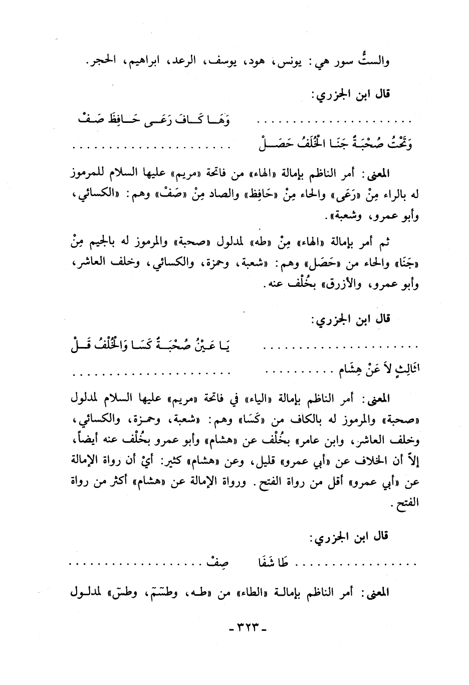 ثم أمر بإمالة «الهاء» من «طه» لمدلول «صحبة» والمرموز له بالجيم من «جنا» والحاء من «حصل» وهم: «شعبة، وحمزة، والكسائي، وخلف العاشر، وأبو عمرو، والأزرق» بخلف عنه.
