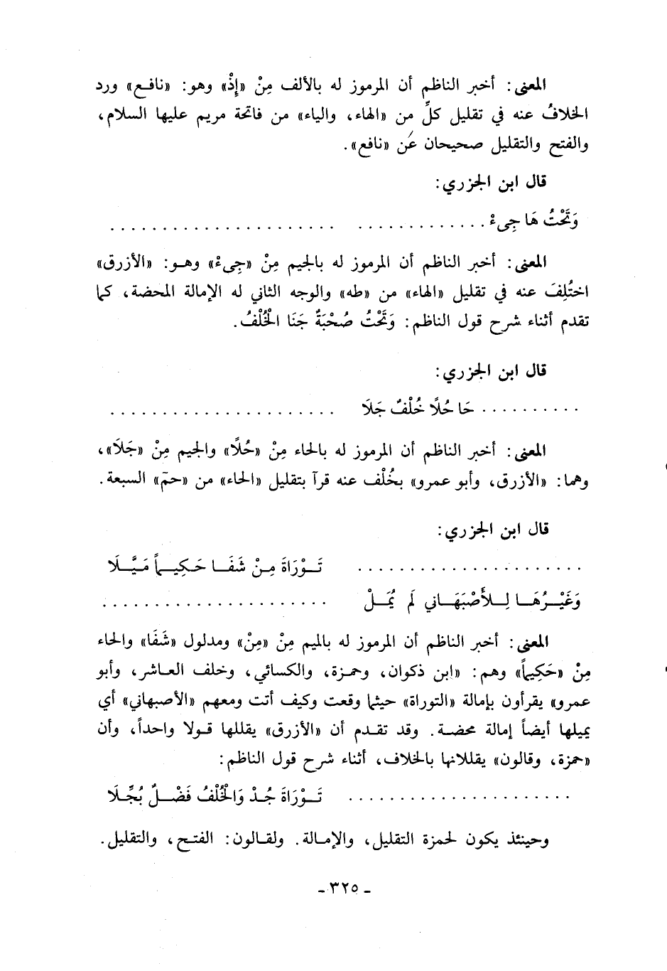 المعنى: أخبر الناظم أن المرموز له بالميم من «من» ومدلول «شفا» والحاء من «حكيما» وهم: «ابن ذكوان، وحمزة، والكسائي، وخلف العاشر، وأبو عمرو» يقرءون بإمالة «التوراة» حيثما وقعت وكيف أتت ومعهم «الأصبهاني» أي يميلها أيضا إمالة محضة. وقد تقدم أن «الأزرق» يقللها قولا واحدا، وأن «حمزة، وقالون» يقللانها بالخلاف، أثناء شرح قول الناظم: