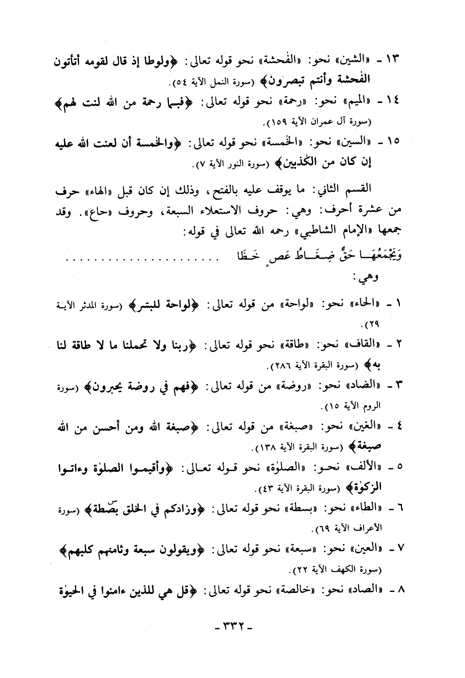 13 - «الشين» نحو: «الفاحشة» نحو قوله تعالى: وَلُوطاً إِذْ قالَ لِقَوْمِهِ أَتَأْتُونَ الْفاحِشَةَ وَأَنْتُمْ تُبْصِرُونَ (سورة النمل الآية 54).