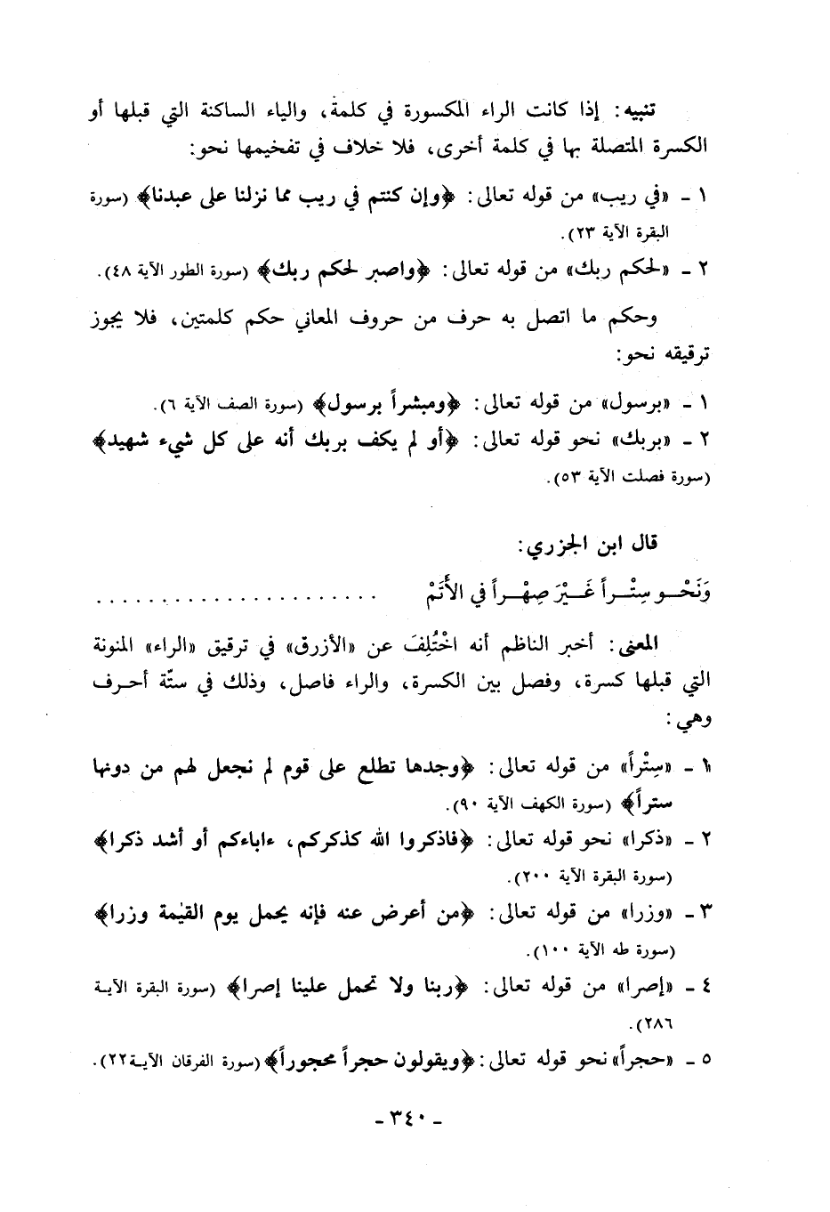 تنبيه: إذا كانت الراء المكسورة في كلمة، والياء الساكنة التي قبلها أو الكسرة المتصلة بها في كلمة أخرى، فلا خلاف في تفخيمها نحو: