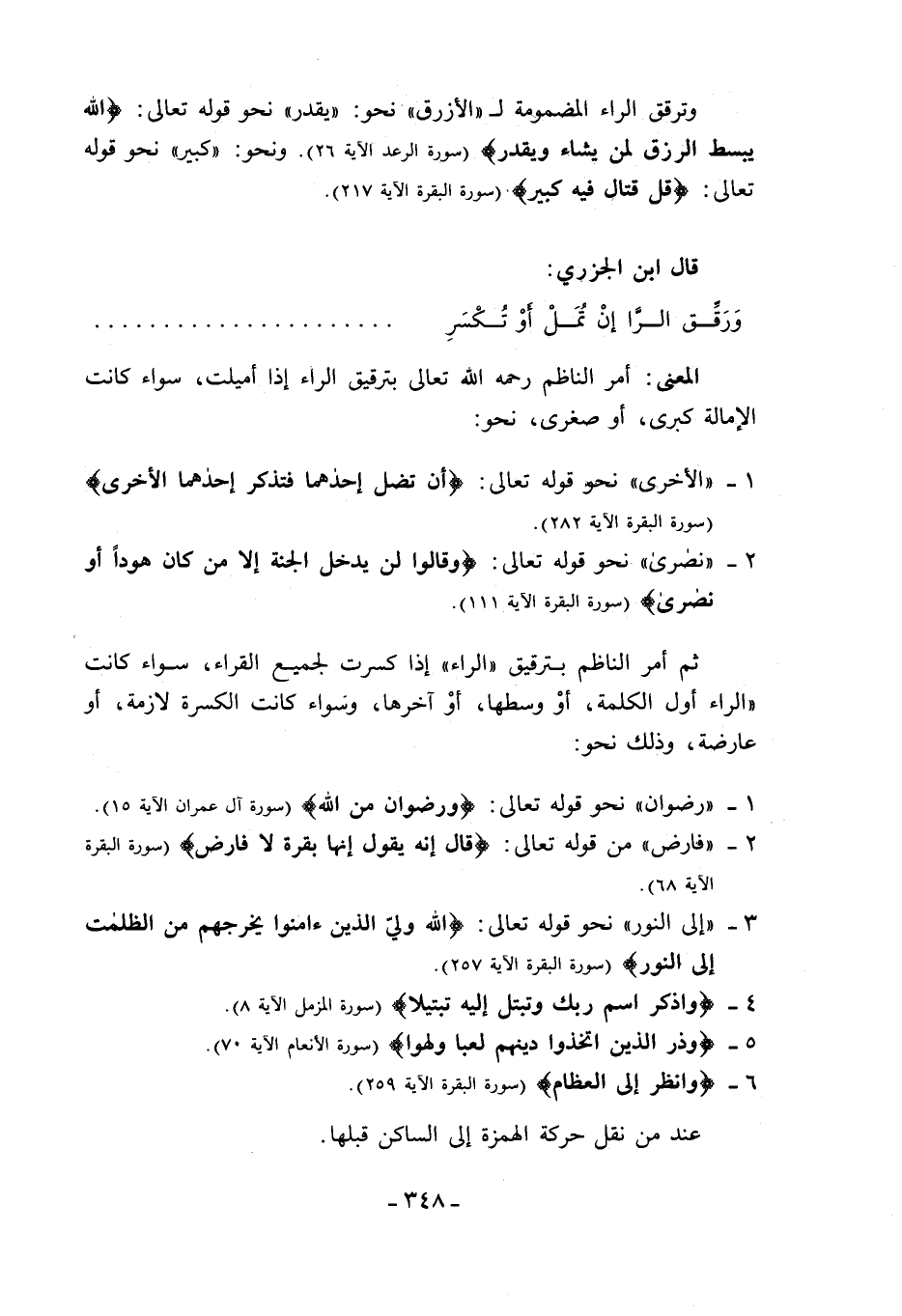 ثم أمر الناظم بترقيق «الراء» إذا كسرت لجميع القراء، سواء كانت «الراء أول الكلمة، أو وسطها، أو آخرها، وسواء كانت الكسرة لازمة، أو عارضة، وذلك نحو:
