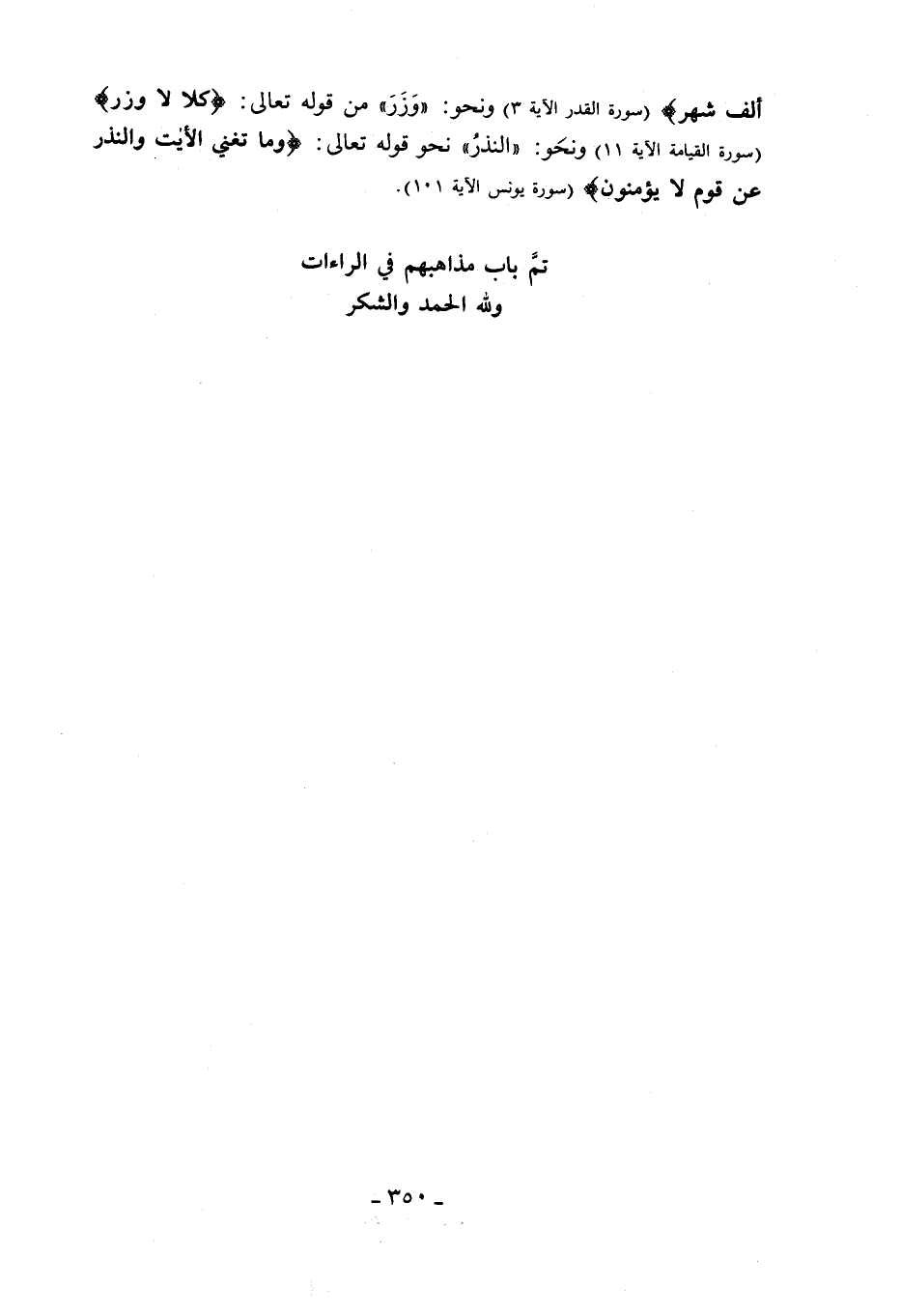 أَلْفِ شَهْرٍ (سورة القدر الآية 3) ونحو: «وزر» من قوله تعالى: كَلَّا لا وَزَرَ (سورة القيامة الآية 11) ونحو: «النذر» نحو قوله تعالى: وَما تُغْنِي الْآياتُ وَالنُّذُرُ عَنْ قَوْمٍ لا يُؤْمِنُونَ (سورة يونس الآية 101).