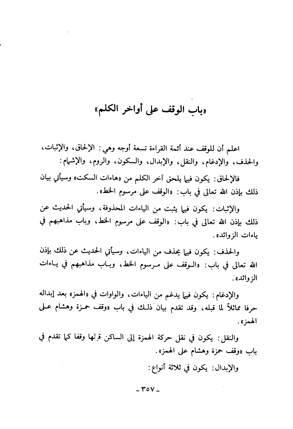 اعلم أن للوقف عند أئمة القراءة تسعة أوجه وهي: الإلحاق، والإثبات، والحذف، والإدغام، والنقل، والإبدال، والسكون، والروم، والإشمام: