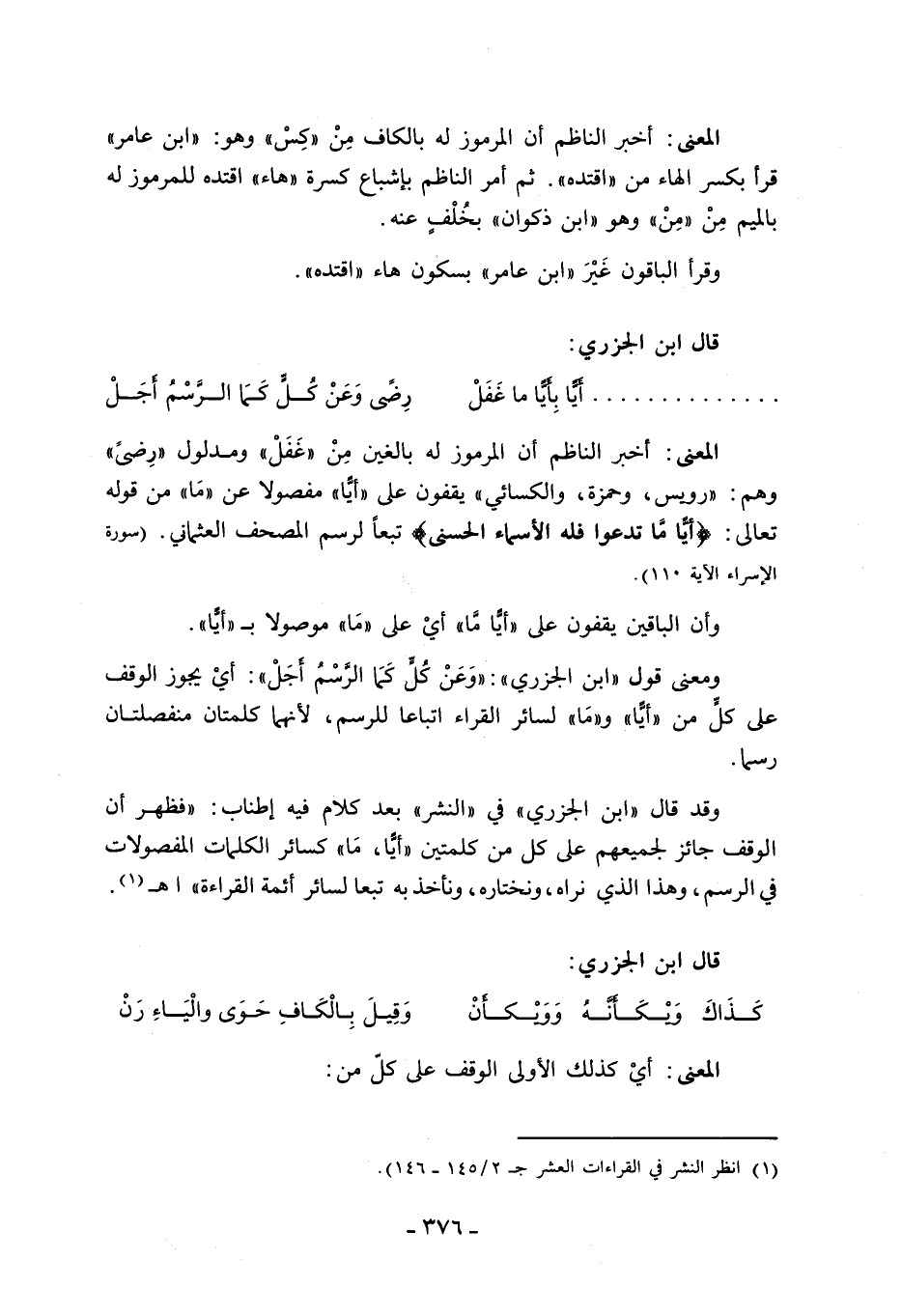 ومعنى قول «ابن الجزري»: «وعن كلّ كما الرّسم أجل»: أي يجوز الوقف على كلّ من «أيّا» و «ما» لسائر القراء اتباعا للرسم، لأنهما كلمتان منفصلتان رسما.