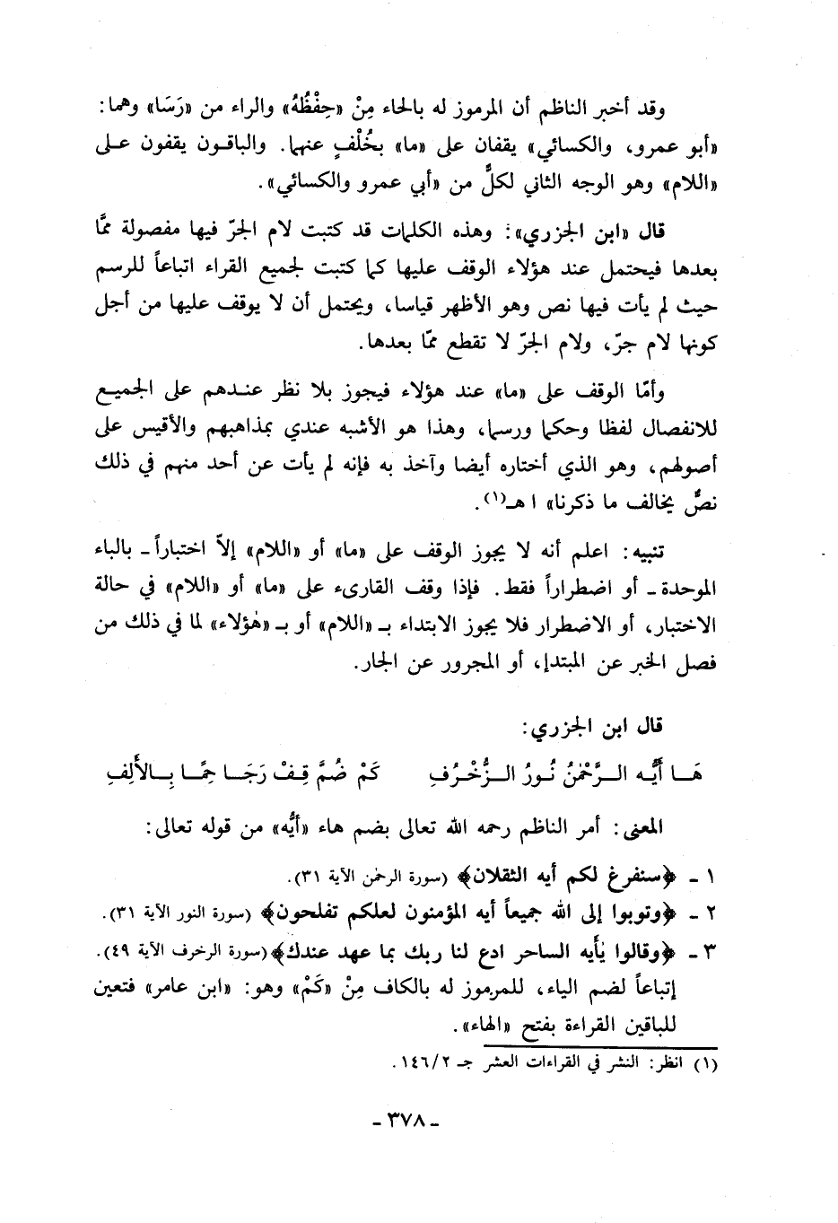 قال «ابن الجزري»: وهذه الكلمات قد كتبت لام الجرّ فيها مفصولة ممّا بعدها فيحتمل عند هؤلاء الوقف عليها كما كتبت لجميع القراء اتباعا للرسم حيث لم يأت فيها نص وهو الأظهر قياسا، ويحتمل أن لا يوقف عليها من أجل كونها لام جرّ، ولام الجرّ لا تقطع ممّا بعدها.