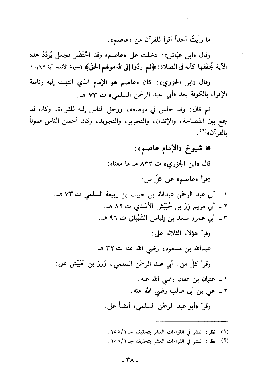 الجزري»: كان «عاصم هو الإمام الذي انتهت إليه رئاسة الإقراء بالكوفة بعد «أبي عبد الرحمن السلمي» ت 73 هـ.