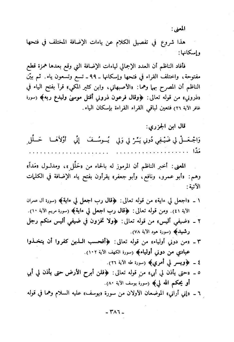 فأفاد الناظم أن العدد الإجمالي لياءات الإضافة التي وقع بعدها همزة قطع مفتوحة، واختلف القراء في فتحها وإسكانها- 99 - تسع وتسعون ياء. ثم بيّن الناظم أن المصرح بهما وهما: «الأصبهاني، وابن كثير المكي» قرآ بفتح الياء في «ذروني» من قوله تعالى: وَقالَ فِرْعَوْنُ ذَرُونِي أَقْتُلْ مُوسى وَلْيَدْعُ رَبَّهُ (سورة غافر الآية 26) فتعين لباقي القراء القراءة بإسكان الياء.