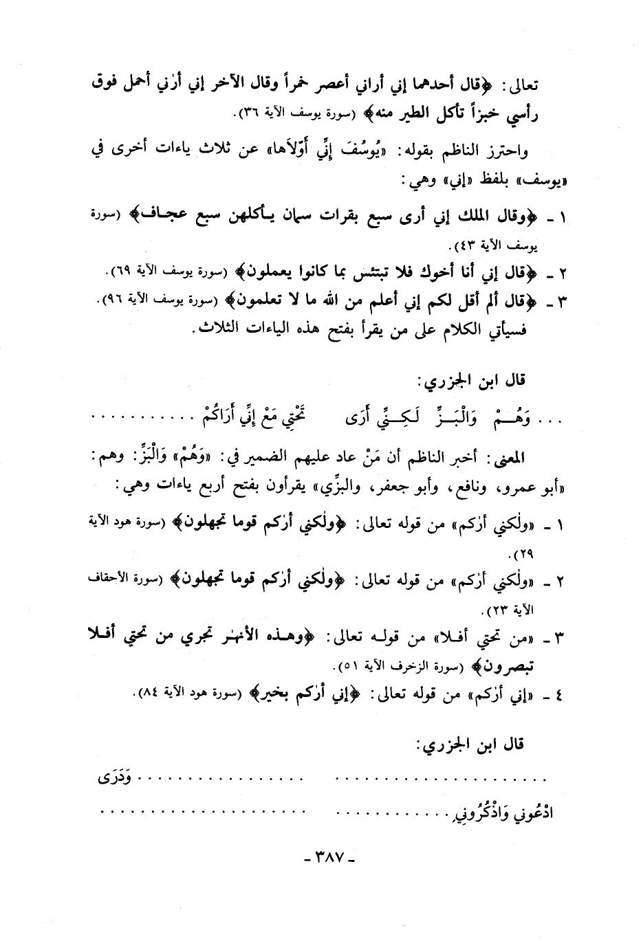 واحترز الناظم بقوله: «يوسف إنّي أوّلاها» عن ثلاث ياءات أخرى في «يوسف» بلفظ «إني» وهي: