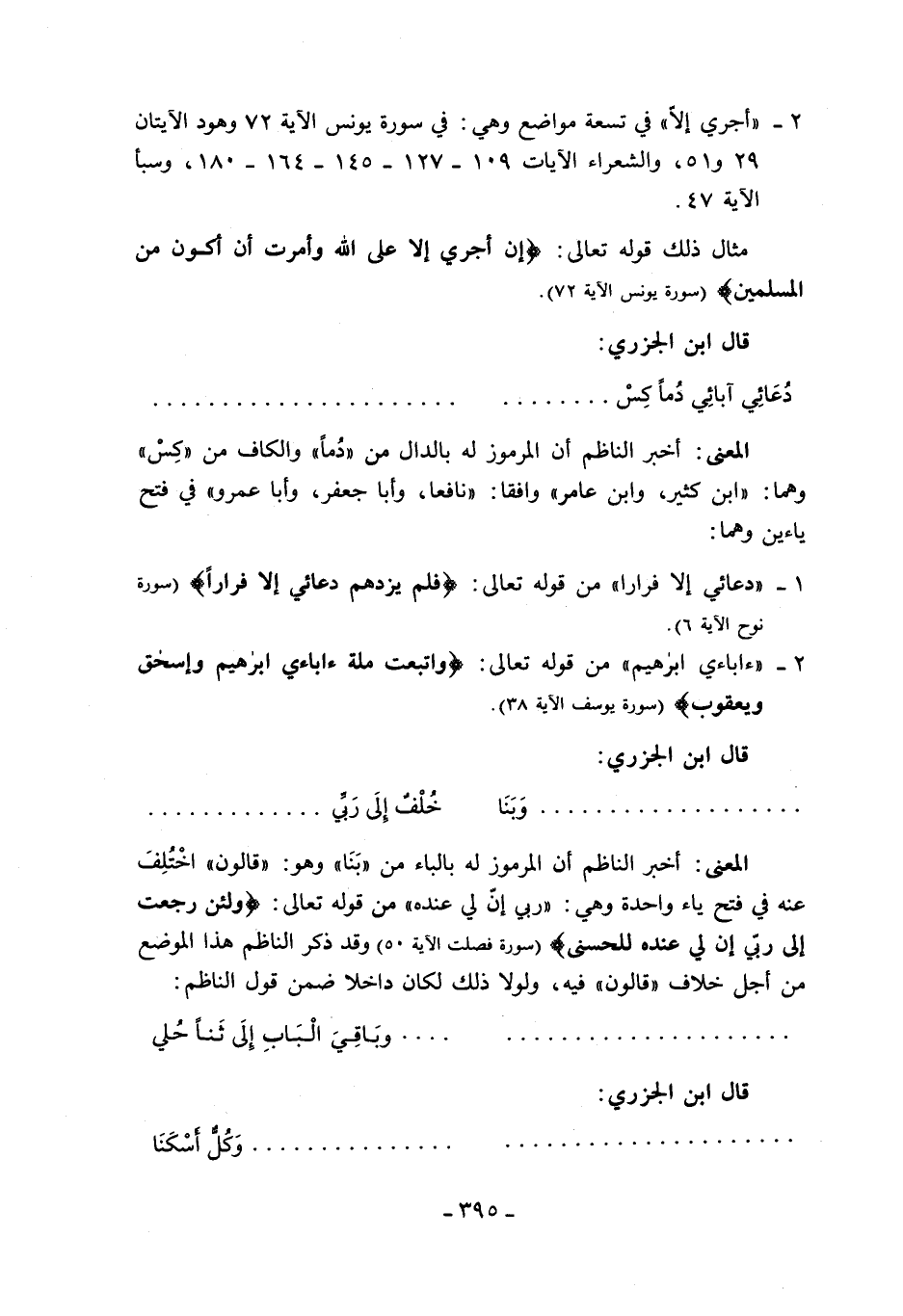 2 - «أجري إلّا» في تسعة مواضع وهي: في سورة يونس الآية 72 وهود الآيتان 29 و 51، والشعراء الآيات 109 - 127 - 145 - 164 - 180، وسبأ الآية 47.