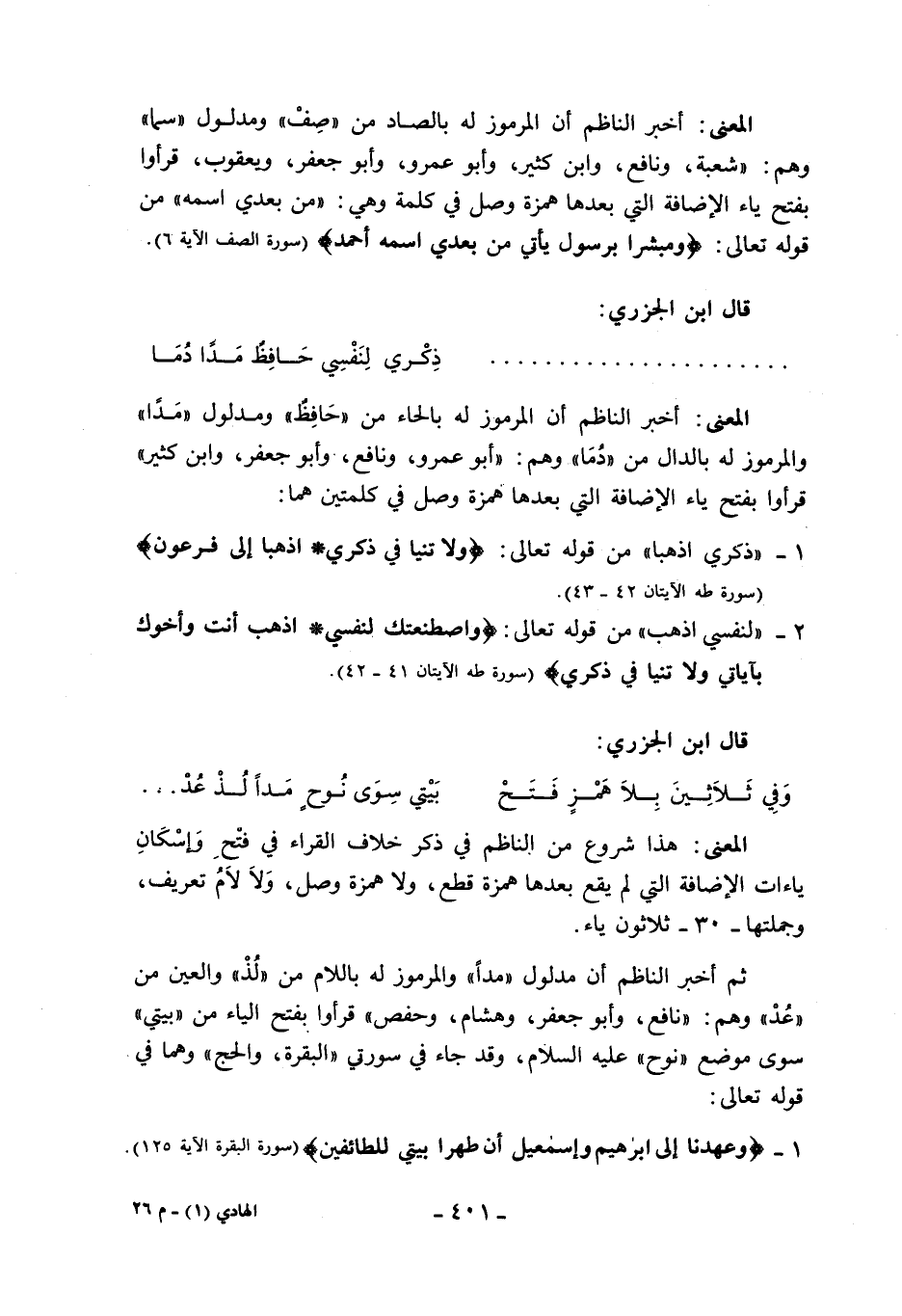 ثم أخبر الناظم أن مدلول «مدا» والمرموز له باللام من «لذ» والعين من «عد» وهم: «نافع، وأبو جعفر، وهشام، وحفص» قرءوا بفتح الياء من «بيتي» سوى موضع «نوح» عليه السلام، وقد جاء في سورتي «البقرة، والحج» وهما في قوله تعالى: