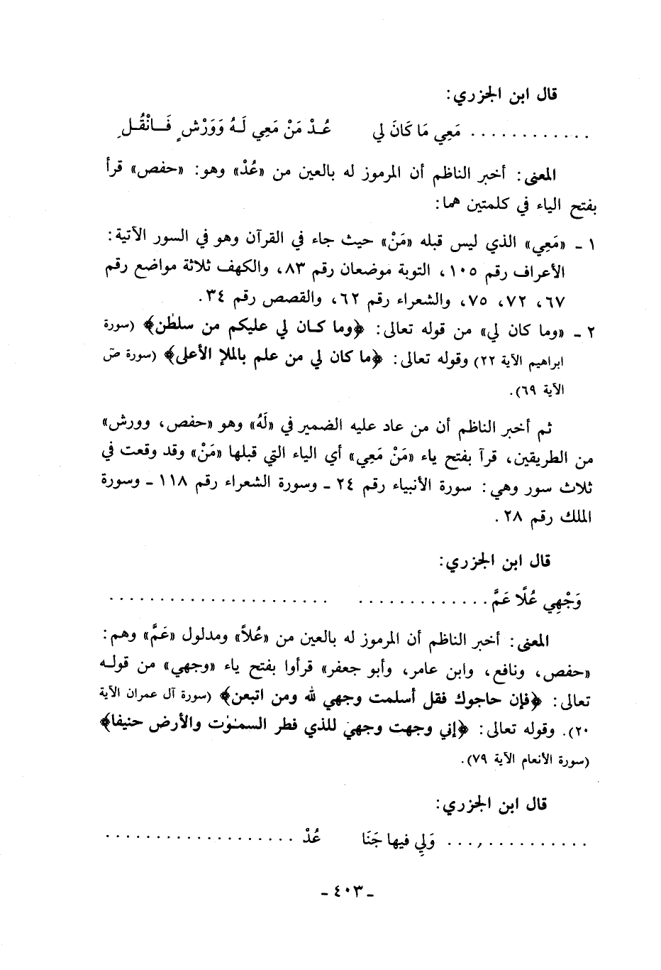 «حفص، ونافع، وابن عامر، وأبو جعفر» قرءوا بفتح ياء «وجهي» من قوله تعالى: فَإِنْ حَاجُّوكَ فَقُلْ أَسْلَمْتُ وَجْهِيَ لِلَّهِ وَمَنِ اتَّبَعَنِ (سورة آل عمران الآية 20). وقوله تعالى: إِنِّي وَجَّهْتُ وَجْهِيَ لِلَّذِي فَطَرَ السَّماواتِ وَالْأَرْضَ حَنِيفاً (سورة الأنعام الآية 79).
