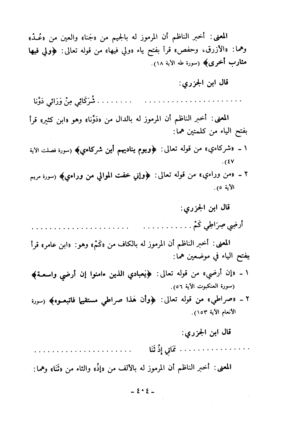 المعنى: أخبر الناظم أن المرموز له بالجيم من «جنا» والعين من «عد» وهما: «الأزرق، وحفص» قرآ بفتح ياء «ولي فيها» من قوله تعالى: وَلِيَ فِيها مَآرِبُ أُخْرى (سورة طه
