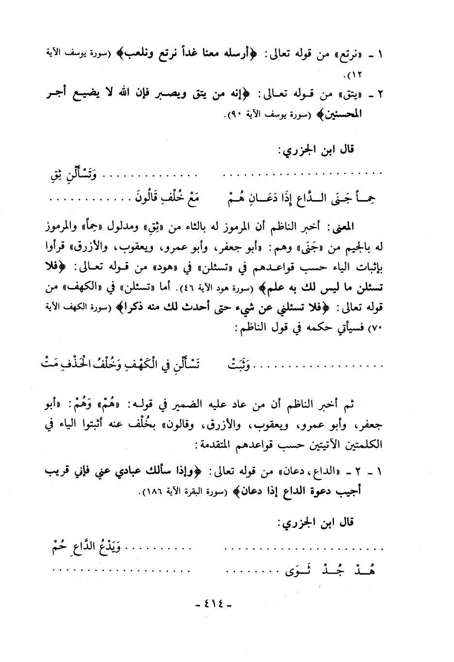 المعنى: أخبر الناظم أن المرموز له بالثاء من «ثق» ومدلول «حما» والمرموز له بالجيم من «جنى» وهم: «أبو جعفر، وأبو عمرو، ويعقوب، والأزرق» قرءوا بإثبات الياء حسب قواعدهم في «تسألن» في «هود» من قوله تعالى: فَلا تَسْئَلْنِ ما لَيْسَ لَكَ بِهِ عِلْمٌ (سورة هود الآية 46). أما «تسألن» في «الكهف» من قوله تعالى: فَلا تَسْئَلْنِي عَنْ شَيْءٍ حَتَّى أُحْدِثَ لَكَ مِنْهُ ذِكْراً (سورة الكهف الآية 70) فسيأتي حكمه في قول الناظم: