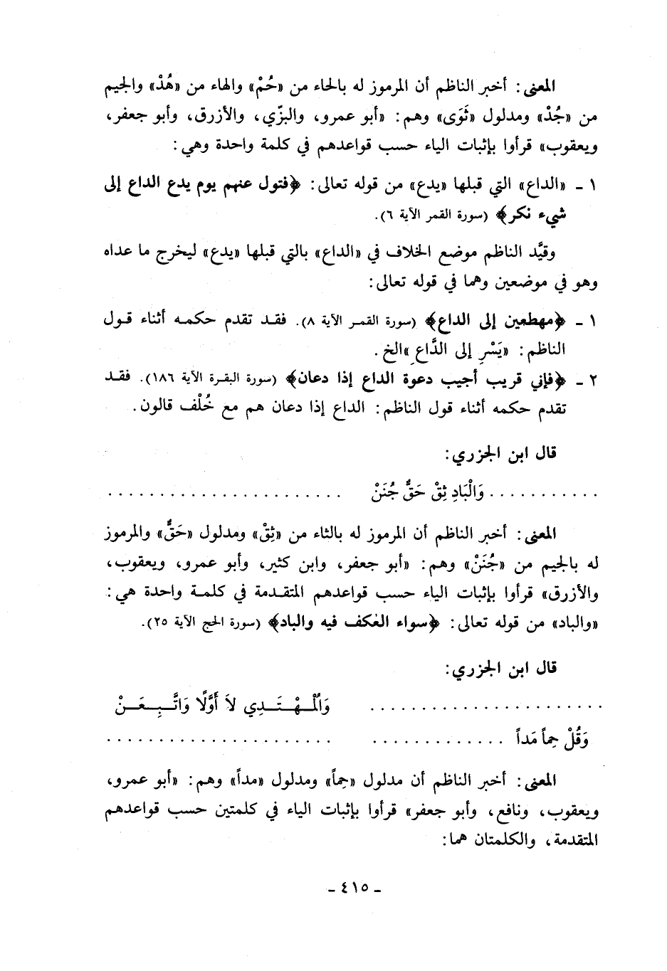 1 - مُهْطِعِينَ إِلَى الدَّاعِ (سورة القمر الآية 8). فقد تقدم حكمه أثناء قول الناظم: «يسر إلى الدّاع» الخ.