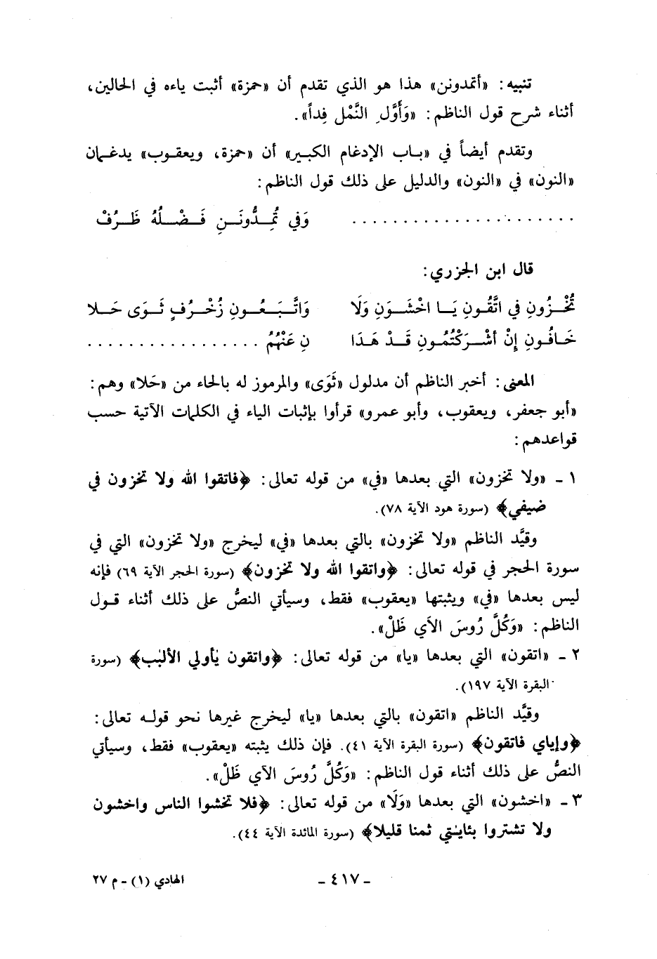 وَإِيَّايَ فَاتَّقُونِ (سورة البقرة الآية 41). فإن ذلك يثبته «يعقوب» فقط، وسيأتي النصّ على ذلك أثناء قول الناظم: «وكلّ روس الآي ظل».
