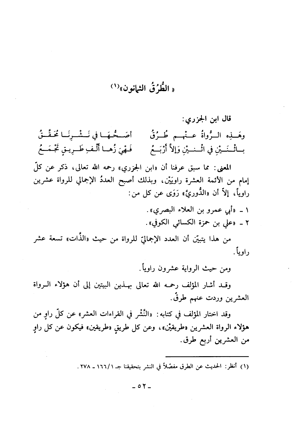 المعنى: مما سبق عرفنا أن «ابن الجزري» رحمه الله تعالى، ذكر عن كلّ إمام من الأئمة العشرة راويين، وبذلك أصبح العدد الإجمالي للرواة عشرين راويا، إلّا أن «الدّوريّ» روى عن كل من: