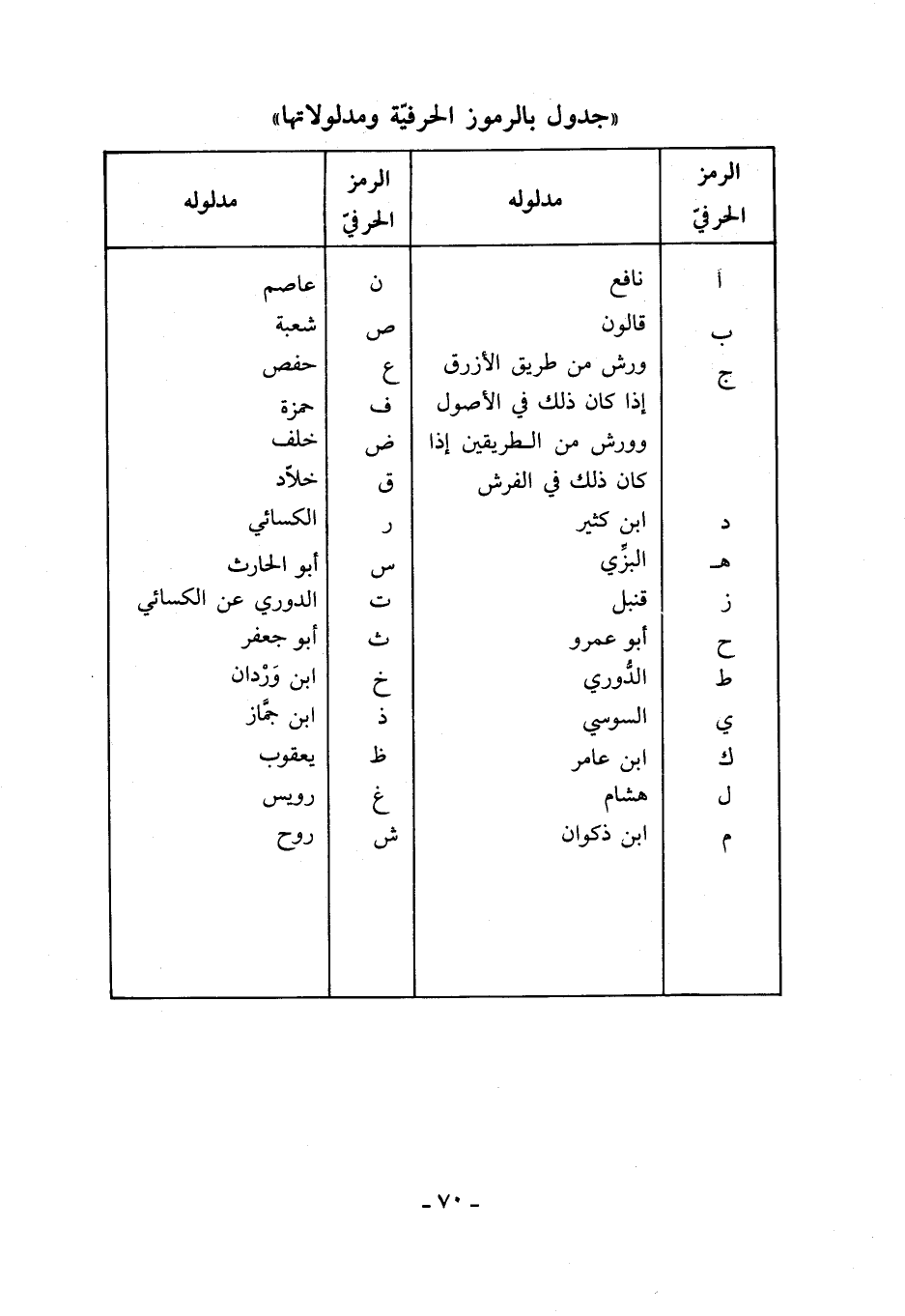 الرمز الحرفيّ/ مدلوله ا/ نافع ب/ قالون ج/ ورش من طريق الأزرق إذا كان ذلك في الأصول وورش من الطريقين إذا كان ذلك في الفرش د/ ابن كثير هـ-/ البزّي ز/ قنبل ح/ أبو عمرو ط/ الدّوري ي/ السوسي ك/ ابن عامر ل/ هشام م/ ابن ذكوان الرمز الحرفيّ/ مدلوله ن/ عاصم ص/ شبعة ع/ حفص ف/ حمزة ض/ خلف ق/ خلّاد ر/ الكسائي س/ أبو الحارث ت/ الدوري عن الكسائي ث/ أبو جعفر خ/ ابن وردان ذ/ ابن جماز ظ/ يعقوب غ/ رويس ش/ روح