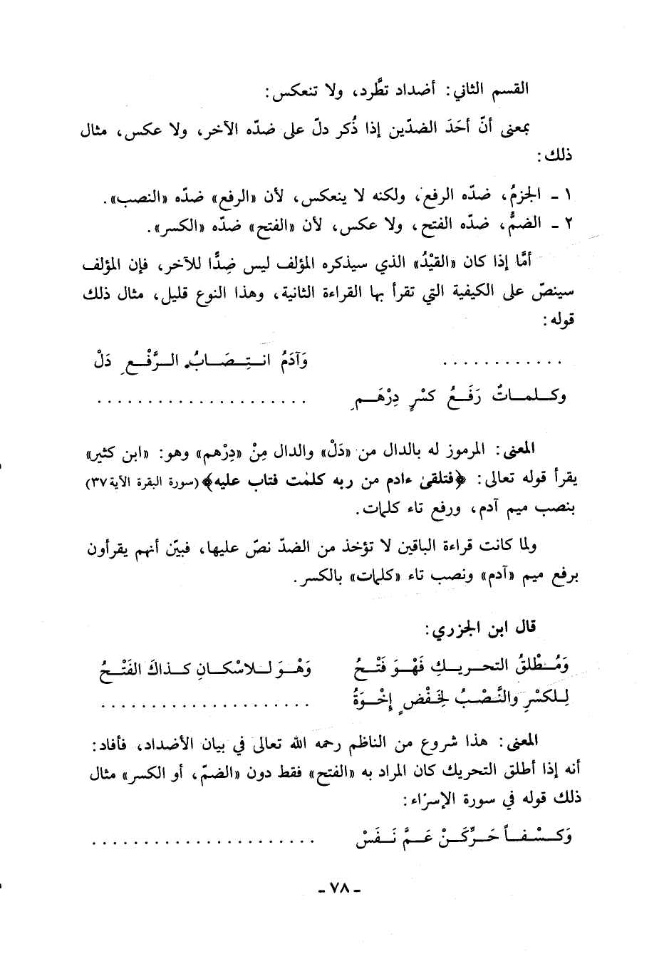 ولما كانت قراءة الباقين لا تؤخذ من الضدّ نصّ عليها، فبيّن أنهم يقرءون برفع ميم «آدم» ونصب تاء «كلمات» بالكسر.