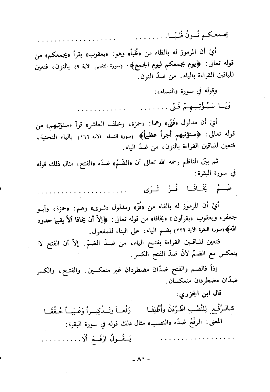 ثم بيّن الناظم رحمه الله تعالى أن «الضمّ» ضدّه «الفتح» مثال ذلك قوله في سورة البقرة: