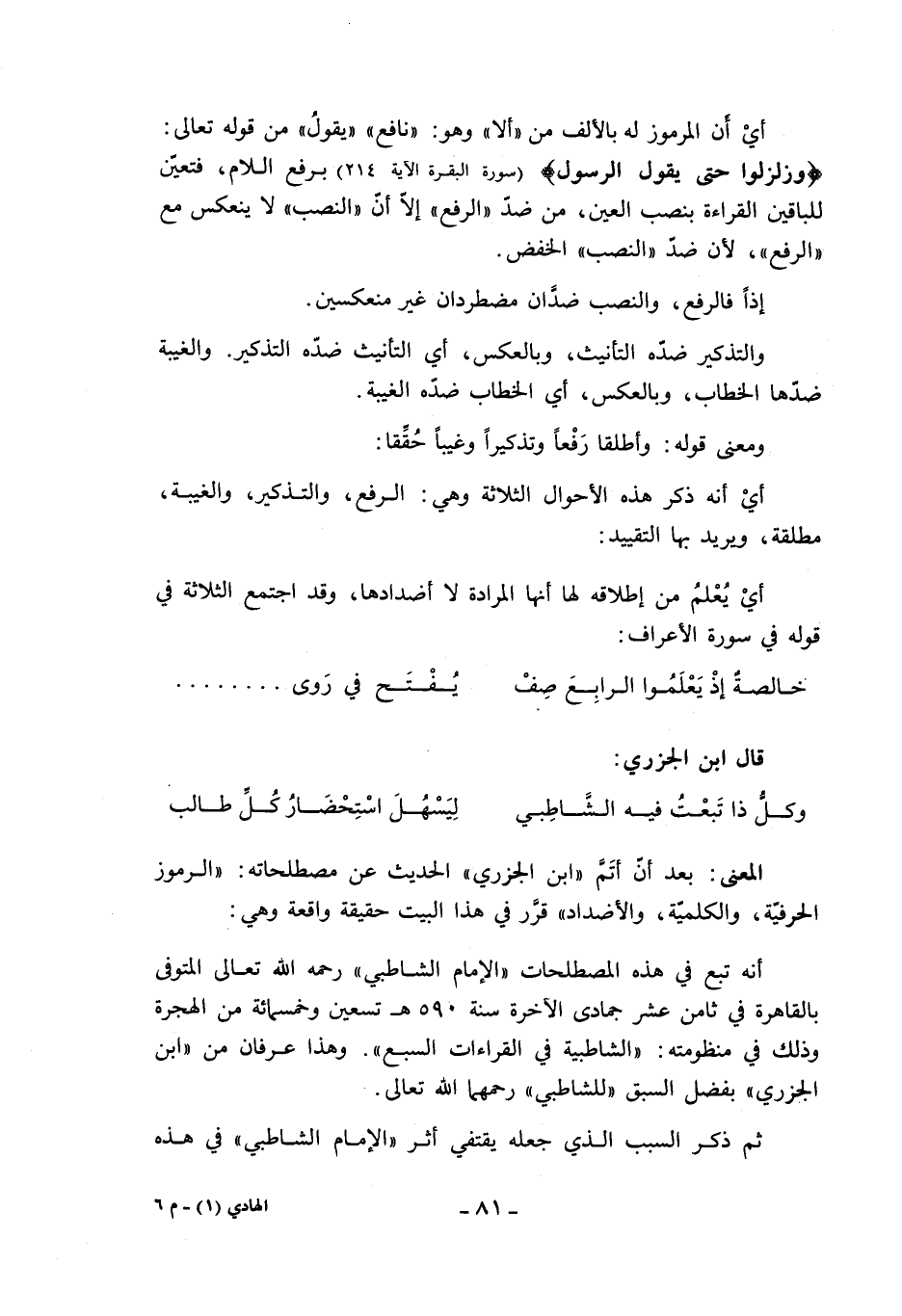 المعنى: بعد أنّ أتمّ «ابن الجزري» الحديث عن مصطلحاته: «الرموز الحرفيّة، والكلميّة، والأضداد» قرّر في هذا البيت حقيقة واقعة وهي: