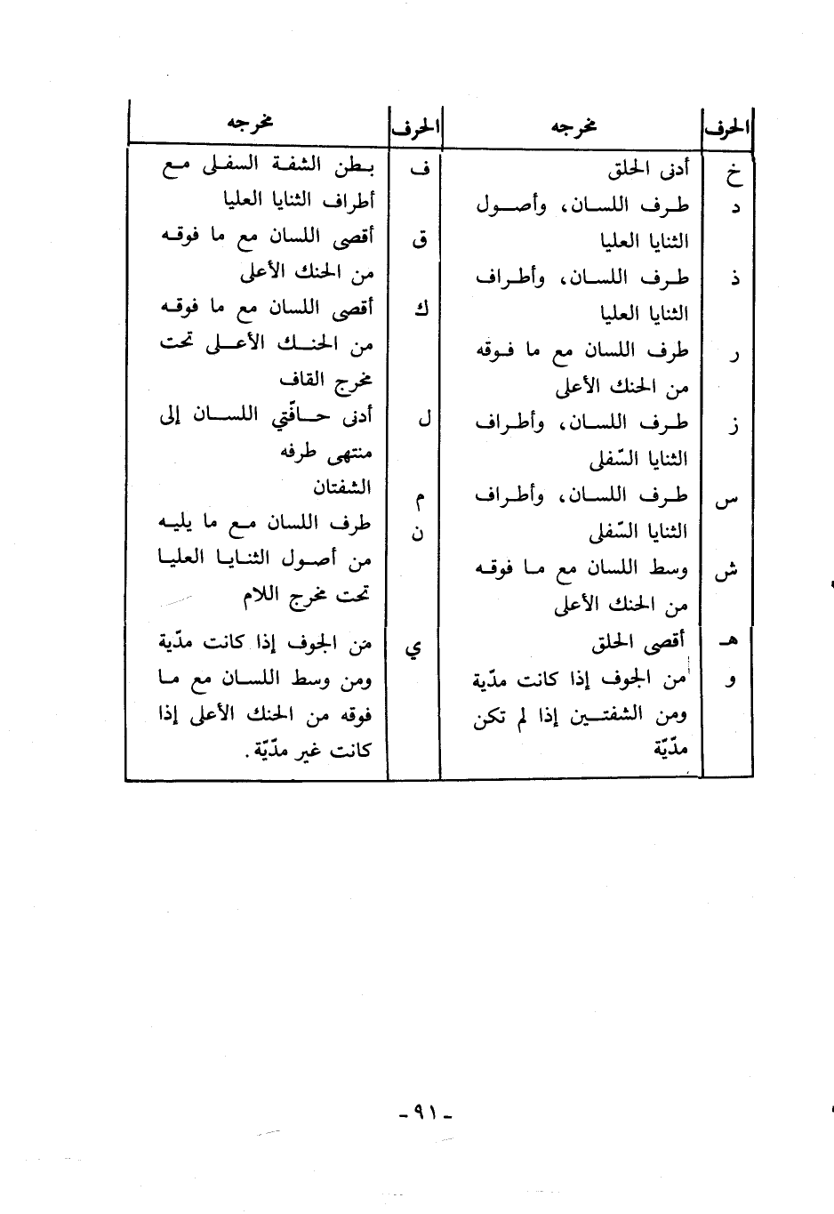 الحرف/ مخرجه خ/ أدنى الحلق د/ طرف اللسان، وأصول الثنايا العليا ذ/ طرف اللسان، وأطراف الثنايا العليا ر/ طرف اللسان مع ما فوقه من الحنك الأعلى ز/ طرف اللسان، وأطراف الثنايا السّفلى س/ طرف اللسان، وأطراف الثنايا السّفلى ش/ وسط اللسان مع ما فوقه من الحنك الأعلى هـ/ أقصى الحلق و/ من الجوف إذا كانت مدّية ومن الشفتين إذا لم تكن مدّيّة الحرف/ مخرجه ف/ بطن الشفة السفلى مع أطراف الثنايا العليا ق/ أقصى اللسان مع ما فوقه من الحنك الأعلى ك/ أقصى اللسان مع ما فوقه من الحنك الأعلى مخرج القاف ل/ أدنى حافّتي اللسان إلى منتهى طرفه م/ الشفتان ن/ طرف اللسان مع ما يليه من أصول الثنايا العليا تحت مخرج اللام ي/ من الجوف إذا كانت مدّية ومن وسط اللسان مع ما فوقه من الحنك الأعلى إذا كانت غير مدّيّة.