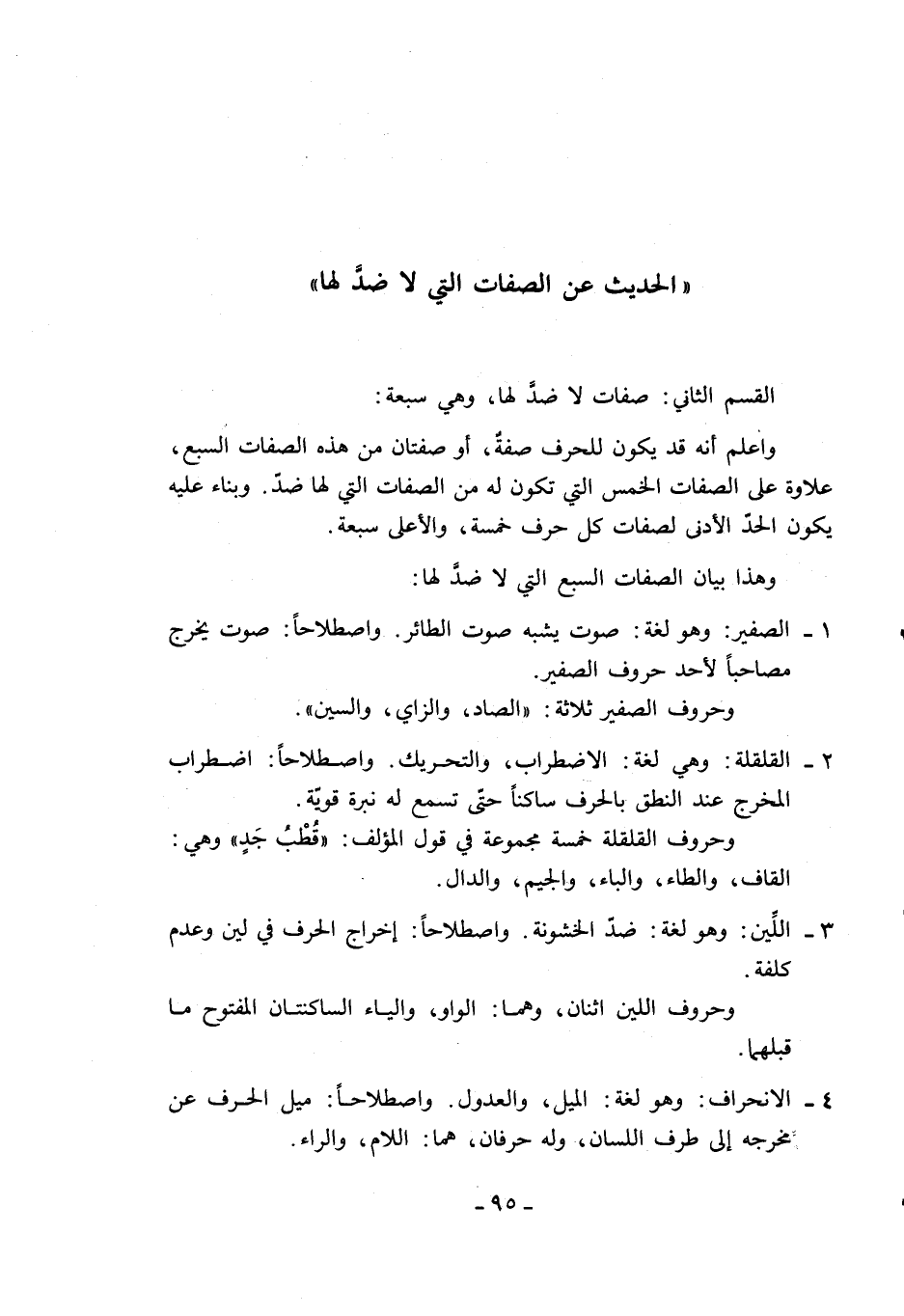 واعلم أنه قد يكون للحرف صفة، أو صفتان من هذه الصفات السبع، علاوة على الصفات الخمس التي تكون له من الصفات التي لها ضدّ. وبناء عليه يكون الحدّ الأدنى لصفات كل حرف خمسة، والأعلى سبعة.