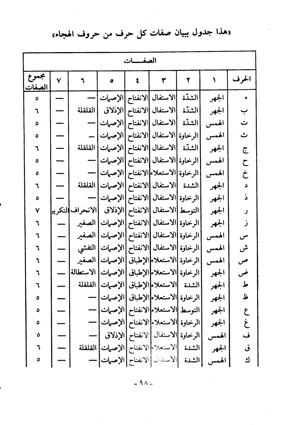 «هذا جدول ببيان صفات كل حرف من حروف الهجاء»
