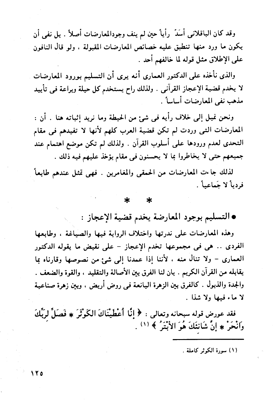 لا يخدم قضية الإعجاز القرآني. ولذلك راح يستخدم كل حيلة وبراعة في تأييد مذهب نفى المعارضات أساساً.