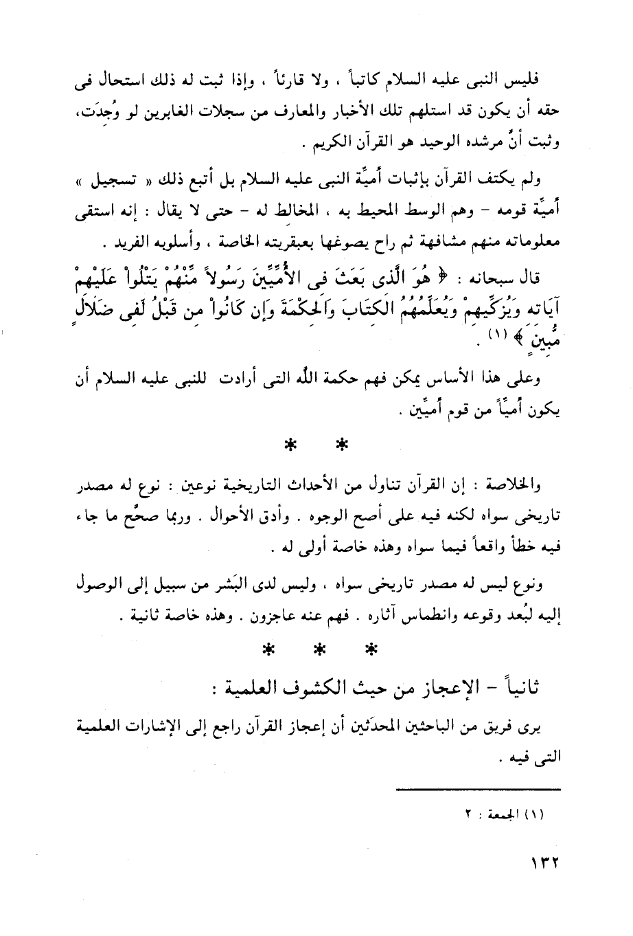 فليس النبي عليه السلام كاتباً، ولا قارئاً، وإذا ثبت له ذلك استحال فى
