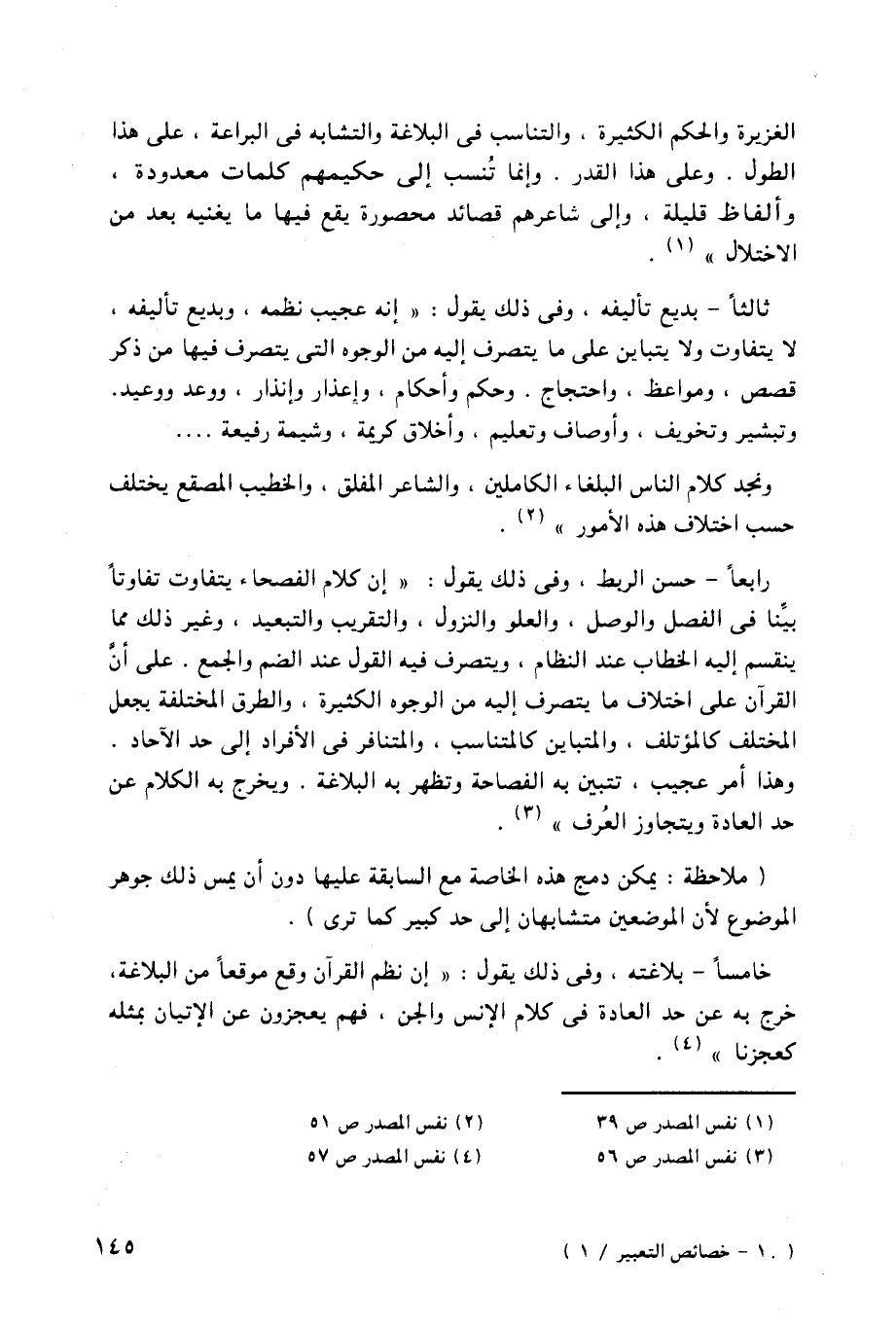 خامساً - بلاغته، وفي ذلك يقول: " إن نظم القرآن وقع موقعاً من البلاغة، خرج به عن حد العادة في كلام الإنس والجن، فهم يعجزون عن الإتيان بمثله كعجزناً.