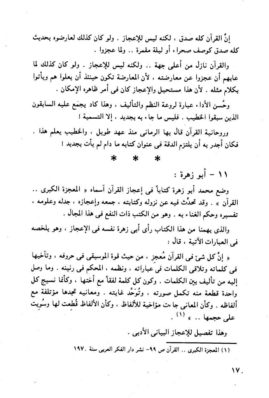 والذي يهمنا من هذا الكتاب رأى أبى زهرة نفسه في الإعجاز، وهو يلخصه