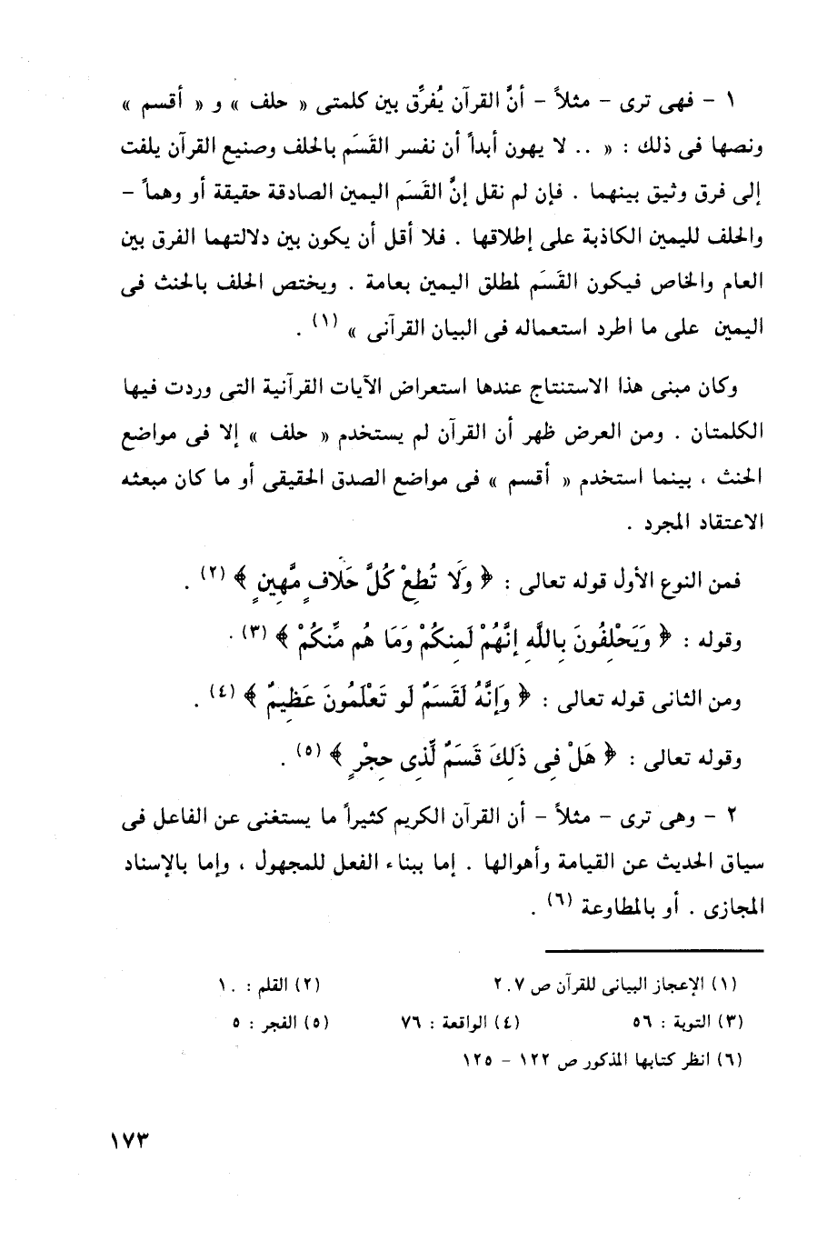 ونصها في ذلك: ". . لا يهون أبداً أن نفسر القَسَم بالحلف وصنيع القرآن يلفت إلى فرق وثيق بينهما. فإن لم نقل إن القَسَم اليمين الصادقة حقيقة أو وهماً -