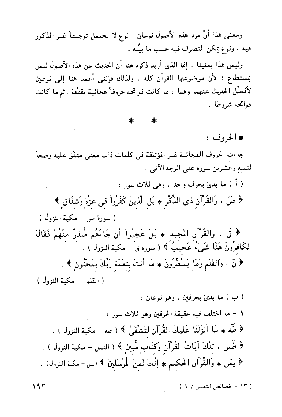 وليس هذا يعنينا. إنما الذي أريد ذكره هنا أن الحديث عن هذه الأصول ليس بمستطاع: لأن موضوعها القرآن كله، ولذلك فإننى أعمد هنا إلى نوعين لأفصل الحديث عنهما وهما: ما كانت فواتحه حروفاً هجائية مقطَّعة، ثم ما كانت فواتحه شروطاً.