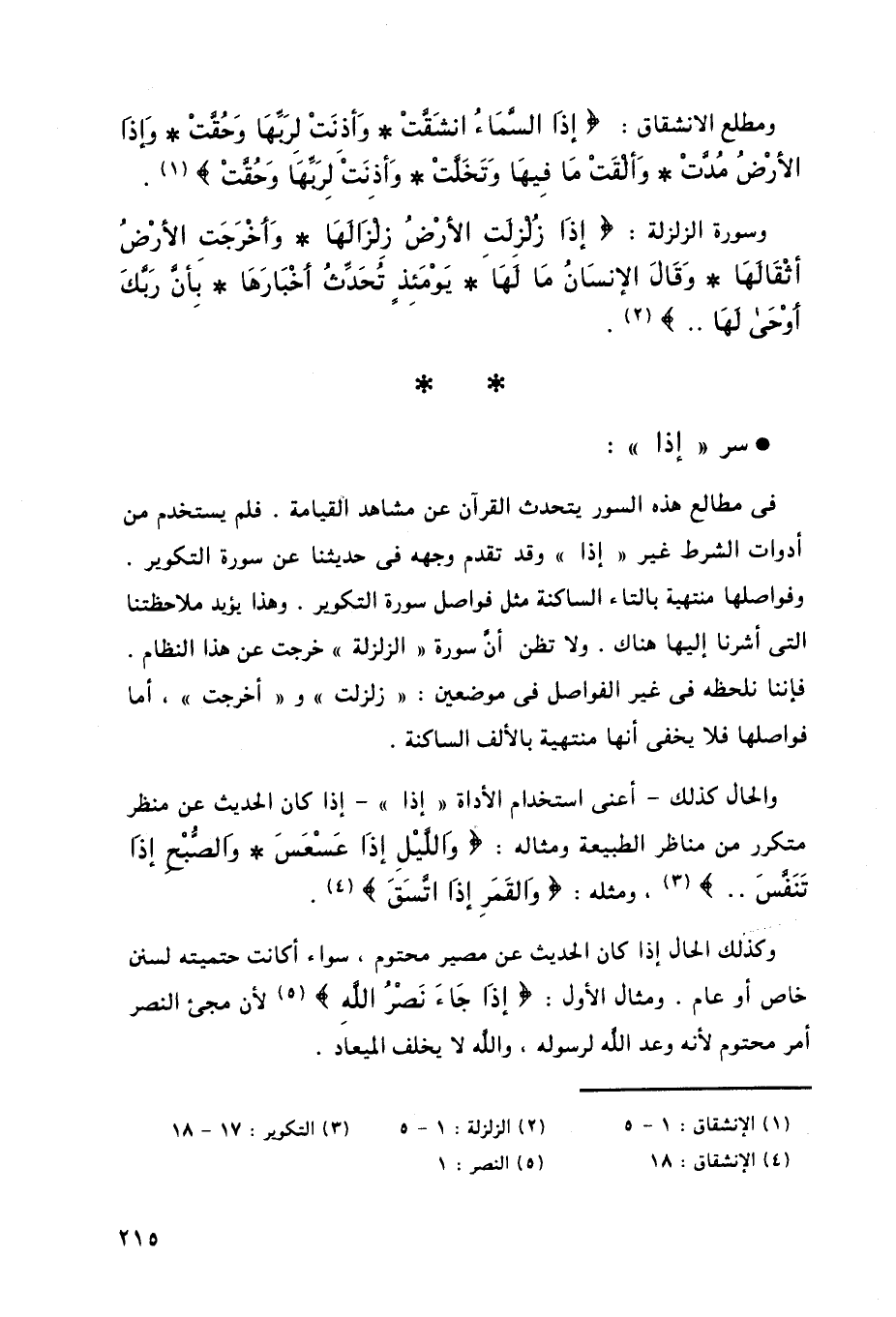 وفواصلها منتهية بالتاء الساكنة مثل فواصل سورة التكوير. وهذا يؤيد ملاحظتنا التي أشرنا إليها هناك. ولا تظن أن سورة " الزلزلة " خرجت عن هذا النظام.