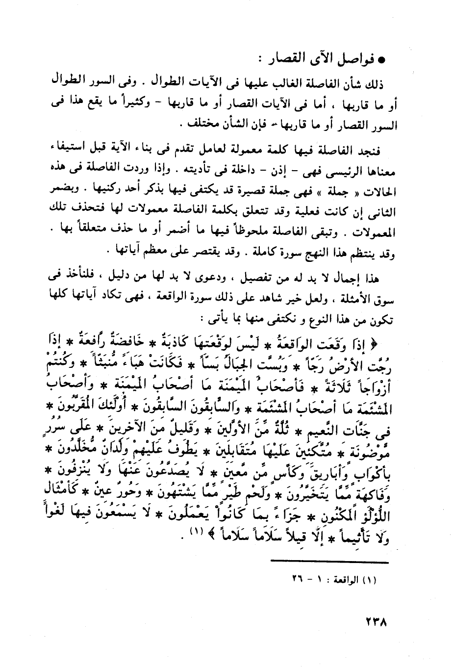 سوق الأمثلة، ولعل خير شاهد على ذلك سورة الواقعة، فهى تكاد آياتها كلها تكون من هذا النوع ونكتفى منها بما يأتي: