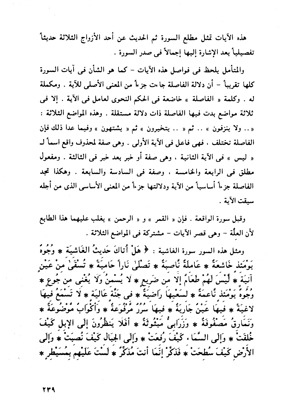 (هَلْ أَتَاكَ حَدِيثُ الْغَاشِيَةِ (1) وُجُوهٌ يَوْمَئِذٍ خَاشِعَةٌ (2) عَامِلَةٌ نَاصِبَةٌ (3) تَصْلَى نَارًا حَامِيَةً (4) تُسْقَى مِنْ عَيْنٍ آنِيَةٍ (5) لَيْسَ لَهُمْ طَعَامٌ إِلَّا مِنْ ضَرِيعٍ (6) لَا يُسْمِنُ وَلَا يُغْنِي مِنْ جُوعٍ (7) وُجُوهٌ يَوْمَئِذٍ نَاعِمَةٌ (8) لِسَعْيِهَا رَاضِيَةٌ (9) فِي جَنَّةٍ عَالِيَةٍ (10) لَا تَسْمَعُ فِيهَا لَاغِيَةً (11) فِيهَا عَيْنٌ جَارِيَةٌ (12) فِيهَا سُرُرٌ مَرْفُوعَةٌ (13) وَأَكْوَابٌ مَوْضُوعَةٌ (14) وَنَمَارِقُ مَصْفُوفَةٌ (15) وَزَرَابِيُّ مَبْثُوثَةٌ (16) أَفَلَا يَنْظُرُونَ إِلَى الْإِبِلِ كَيْفَ خُلِقَتْ (17) وَإِلَى السَّمَاءِ كَيْفَ رُفِعَتْ (18) وَإِلَى الْجِبَالِ كَيْفَ نُصِبَتْ (19) وَإِلَى الْأَرْضِ كَيْفَ سُطِحَتْ (20) فَذَكِّرْ إِنَّمَا أَنْتَ مُذَكِّرٌ (21) لَسْتَ عَلَيْهِمْ بِمُصَيْطِرٍ (22)