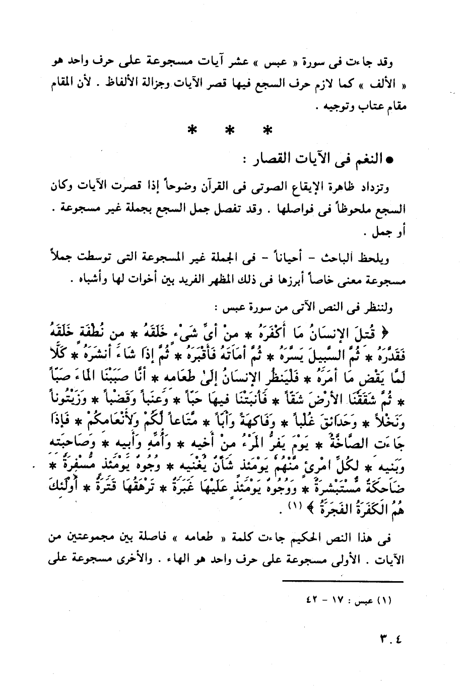 (قُتِلَ الْإِنْسَانُ مَا أَكْفَرَهُ (17) مِنْ أَيِّ شَيْءٍ خَلَقَهُ (18) مِنْ نُطْفَةٍ خَلَقَهُ فَقَدَّرَهُ (19) ثُمَّ السَّبِيلَ يَسَّرَهُ (20) ثُمَّ أَمَاتَهُ فَأَقْبَرَهُ (21) ثُمَّ إِذَا شَاءَ أَنْشَرَهُ (22) كَلَّا لَمَّا يَقْضِ مَا أَمَرَهُ (23) فَلْيَنْظُرِ الْإِنْسَانُ إِلَى طَعَامِهِ (24) أَنَّا صَبَبْنَا الْمَاءَ صَبًّا (25) ثُمَّ شَقَقْنَا الْأَرْضَ شَقًّا (26) فَأَنْبَتْنَا فِيهَا حَبًّا (27) وَعِنَبًا وَقَضْبًا (28) وَزَيْتُونًا وَنَخْلًا (29) وَحَدَائِقَ غُلْبًا (30) وَفَاكِهَةً وَأَبًّا (31) مَتَاعًا لَكُمْ وَلِأَنْعَامِكُمْ (32) فَإِذَا جَاءَتِ الصَّاخَّةُ (33) يَوْمَ يَفِرُّ الْمَرْءُ مِنْ أَخِيهِ (34) وَأُمِّهِ وَأَبِيهِ (35) وَصَاحِبَتِهِ وَبَنِيهِ (36) لِكُلِّ امْرِئٍ مِنْهُمْ يَوْمَئِذٍ شَأْنٌ يُغْنِيهِ (37) وُجُوهٌ يَوْمَئِذٍ مُسْفِرَةٌ (38) ضَاحِكَةٌ مُسْتَبْشِرَةٌ (39) وَوُجُوهٌ يَوْمَئِذٍ عَلَيْهَا غَبَرَةٌ (40) تَرْهَقُهَا قَتَرَةٌ (41) أُولَئِكَ هُمُ الْكَفَرَةُ الْفَجَرَةُ (42) .