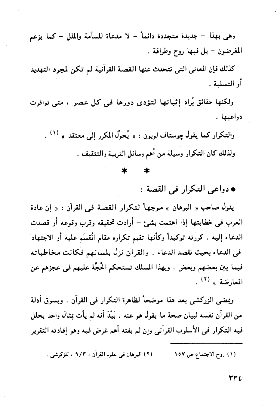 من القرآن نفسه لبيان صحة ما يقول هو عنه. بَيْدَ أنه لم يأت بمثال واحد يحلل فيه التكرار في الأسلوب القرآني وإن لم يفته أهم غرض فيه وهو إفادته التقرير