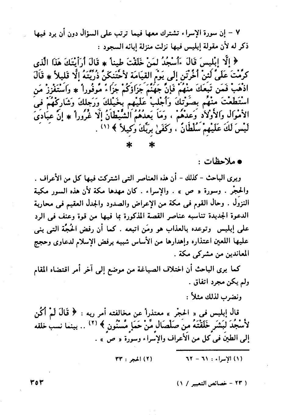ويرى الباحث - كذلك - أن هذه العناصر التي اشتركت فيها كل من الأعراف. والحجْر. وسورة (ص) . والإسراء. كان مهدها مكة لأن هذه السور مكية النزوَل.
