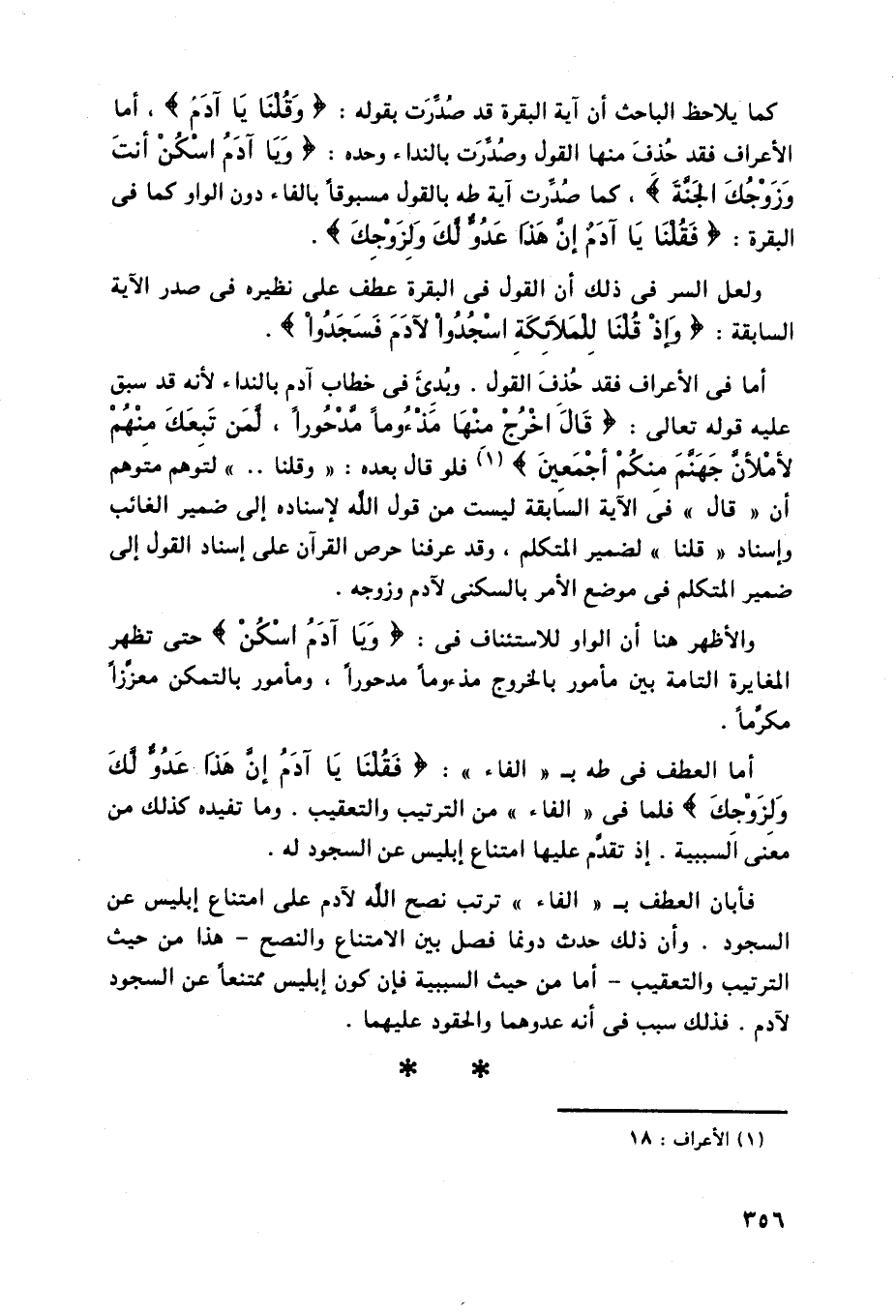 الأعراف فقد حُذفَ منها القول وصُدِّرَت بالنداء وحده: (وَيَا آدَمُ اسْكُنْ أنتَ وَزَوْجُكَ الجَنةَ) ، كما صُدِّرَت آية طه بالقول مسبوقاً بالفاء دون الواو كما فى البقرة: (فَقُلْنَا يَا آدَمُ إِنَّ هَذَا عَدُوٌّ لَكَ وَلِزَوْجِكَ) .