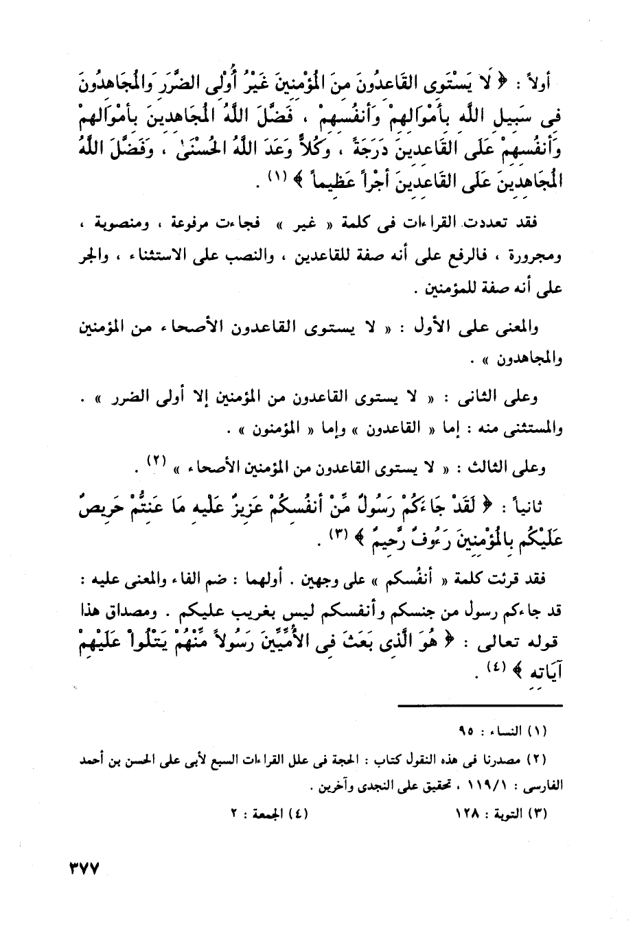 أولاً: (لَا يَسْتَوِي الْقَاعِدُونَ مِنَ الْمُؤْمِنِينَ غَيْرُ أُولِي الضَّرَرِ وَالْمُجَاهِدُونَ فِي سَبِيلِ اللَّهِ بِأَمْوَالِهِمْ وَأَنْفُسِهِمْ فَضَّلَ اللَّهُ الْمُجَاهِدِينَ بِأَمْوَالِهِمْ وَأَنْفُسِهِمْ عَلَى الْقَاعِدِينَ دَرَجَةً وَكُلًّا وَعَدَ اللَّهُ الْحُسْنَى وَفَضَّلَ اللَّهُ الْمُجَاهِدِينَ عَلَى الْقَاعِدِينَ أَجْرًا عَظِيمًا (95) .