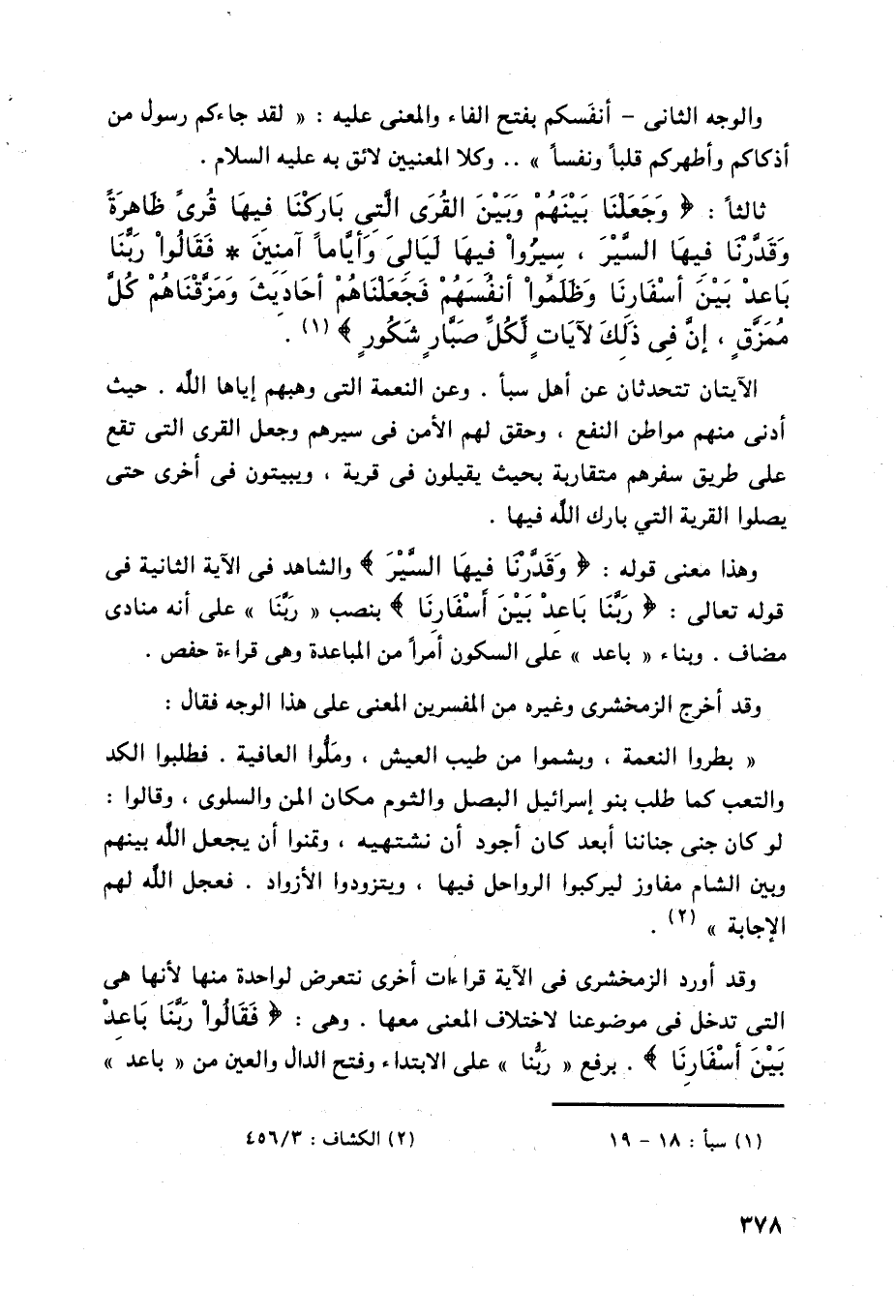 ثالثاً: (وَجَعَلْنَا بَيْنَهُمْ وَبَيْنَ الْقُرَى الَّتِي بَارَكْنَا فِيهَا قُرًى ظَاهِرَةً وَقَدَّرْنَا فِيهَا السَّيْرَ سِيرُوا فِيهَا لَيَالِيَ وَأَيَّامًا آمِنِينَ (18) فَقَالُوا رَبَّنَا بَاعِدْ بَيْنَ أَسْفَارِنَا وَظَلَمُوا أَنْفُسَهُمْ فَجَعَلْنَاهُمْ أَحَادِيثَ وَمَزَّقْنَاهُمْ كُلَّ مُمَزَّقٍ إِنَّ فِي ذَلِكَ لَآيَاتٍ لِكُلِّ صَبَّارٍ شَكُورٍ (19) .
