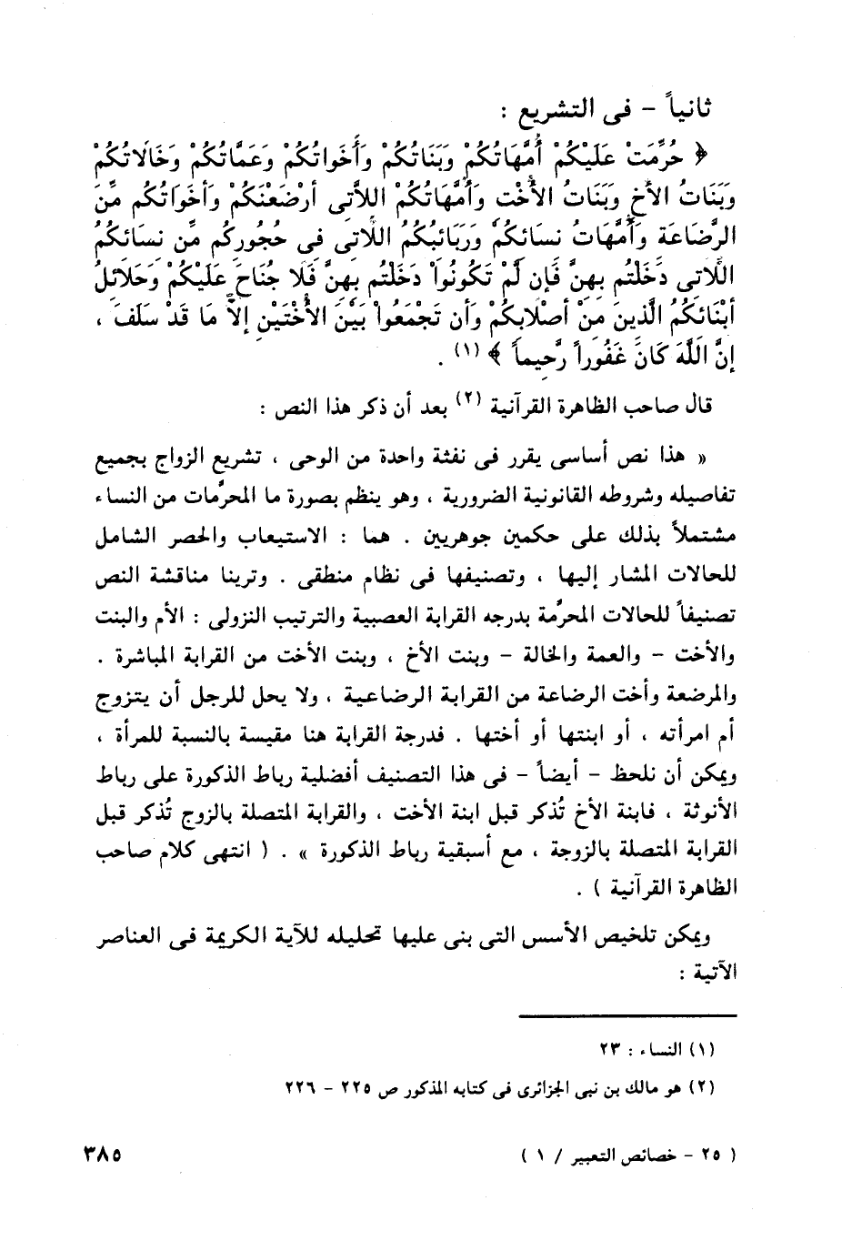 الاستيعاب والحصر الشامل للحالات المشار إليها، وتصنيفها في نظام منطقى. وترينا مناقشة النص تصنيفاً للحالات المحرمة بدرجة القرابة العصبية والترتيب النزولى: الأم والبنت والأخت - والعمة والخالة - وبنت الأخ، وبنت الأخت من القرابة المباشرة.
