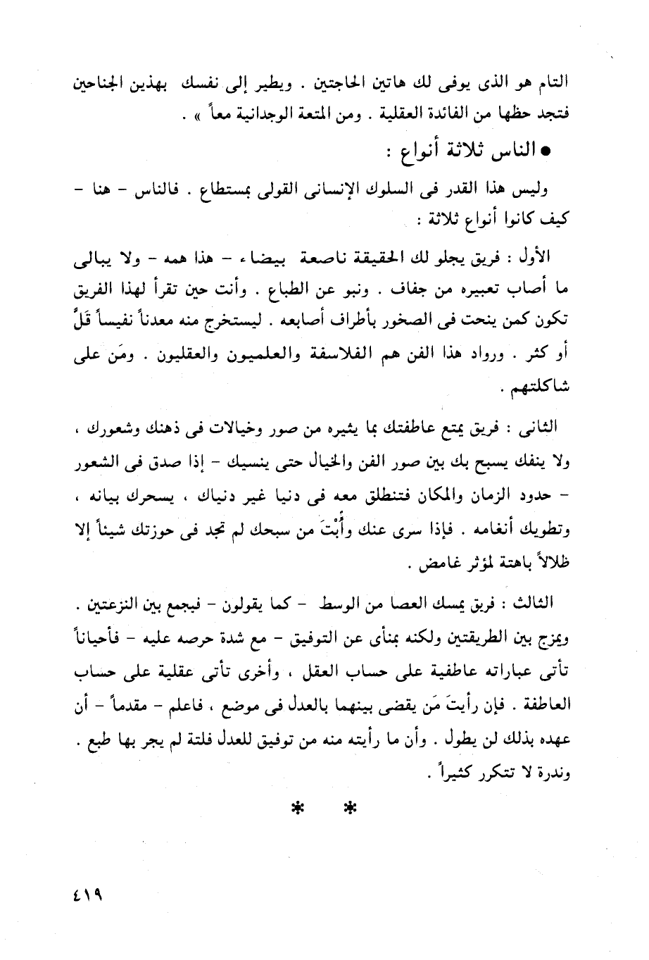 ويمزج بين الطريقتين ولكنه بمنأى عن التوفيق - مع شدة حرصه عليه - فأحياناً تأتى عباراته عاطفية على حساب العقل، وأخرى تأتى عقلية على حساب العاطفة. فإن رأيتَ مَن يقضى بينهما بالعدل في موضع، فاعلم - مقدماً - أن عهده بذلك لن يطول.