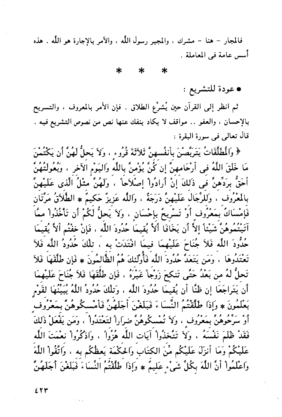 (وَالْمُطَلَّقَاتُ يَتَرَبَّصْنَ بِأَنْفُسِهِنَّ ثَلَاثَةَ قُرُوءٍ وَلَا يَحِلُّ لَهُنَّ أَنْ يَكْتُمْنَ مَا خَلَقَ اللَّهُ فِي أَرْحَامِهِنَّ إِنْ كُنَّ يُؤْمِنَّ بِاللَّهِ وَالْيَوْمِ الْآخِرِ وَبُعُولَتُهُنَّ أَحَقُّ بِرَدِّهِنَّ فِي ذَلِكَ إِنْ أَرَادُوا إِصْلَاحًا وَلَهُنَّ مِثْلُ الَّذِي عَلَيْهِنَّ بِالْمَعْرُوفِ وَلِلرِّجَالِ عَلَيْهِنَّ دَرَجَةٌ وَاللَّهُ عَزِيزٌ حَكِيمٌ (228) الطَّلَاقُ مَرَّتَانِ فَإِمْسَاكٌ بِمَعْرُوفٍ أَوْ تَسْرِيحٌ بِإِحْسَانٍ وَلَا يَحِلُّ لَكُمْ أَنْ تَأْخُذُوا مِمَّا آتَيْتُمُوهُنَّ شَيْئًا إِلَّا أَنْ يَخَافَا أَلَّا يُقِيمَا حُدُودَ اللَّهِ فَإِنْ خِفْتُمْ أَلَّا يُقِيمَا حُدُودَ اللَّهِ فَلَا جُنَاحَ عَلَيْهِمَا فِيمَا افْتَدَتْ بِهِ تِلْكَ حُدُودُ اللَّهِ فَلَا تَعْتَدُوهَا وَمَنْ يَتَعَدَّ حُدُودَ اللَّهِ فَأُولَئِكَ هُمُ الظَّالِمُونَ (229) فَإِنْ طَلَّقَهَا فَلَا تَحِلُّ لَهُ مِنْ بَعْدُ حَتَّى تَنْكِحَ زَوْجًا غَيْرَهُ فَإِنْ طَلَّقَهَا فَلَا جُنَاحَ عَلَيْهِمَا أَنْ يَتَرَاجَعَا إِنْ ظَنَّا أَنْ يُقِيمَا حُدُودَ اللَّهِ وَتِلْكَ حُدُودُ اللَّهِ يُبَيِّنُهَا لِقَوْمٍ يَعْلَمُونَ (230)