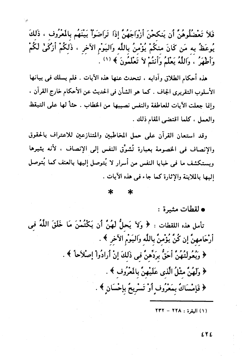 وَإِذَا طَلَّقْتُمُ النِّسَاءَ فَبَلَغْنَ أَجَلَهُنَّ فَأَمْسِكُوهُنَّ بِمَعْرُوفٍ أَوْ سَرِّحُوهُنَّ بِمَعْرُوفٍ وَلَا تُمْسِكُوهُنَّ ضِرَارًا لِتَعْتَدُوا وَمَنْ يَفْعَلْ ذَلِكَ فَقَدْ ظَلَمَ نَفْسَهُ وَلَا تَتَّخِذُوا آيَاتِ اللَّهِ هُزُوًا وَاذْكُرُوا نِعْمَتَ اللَّهِ عَلَيْكُمْ وَمَا أَنْزَلَ عَلَيْكُمْ مِنَ الْكِتَابِ وَالْحِكْمَةِ يَعِظُكُمْ بِهِ وَاتَّقُوا اللَّهَ وَاعْلَمُوا أَنَّ اللَّهَ بِكُلِّ شَيْءٍ عَلِيمٌ (231) وَإِذَا طَلَّقْتُمُ النِّسَاءَ فَبَلَغْنَ أَجَلَهُنَّ فَلَا تَعْضُلُوهُنَّ أَنْ يَنْكِحْنَ أَزْوَاجَهُنَّ إِذَا تَرَاضَوْا بَيْنَهُمْ بِالْمَعْرُوفِ ذَلِكَ يُوعَظُ بِهِ مَنْ كَانَ مِنْكُمْ يُؤْمِنُ بِاللَّهِ وَالْيَوْمِ الْآخِرِ ذَلِكُمْ أَزْكَى لَكُمْ وَأَطْهَرُ وَاللَّهُ يَعْلَمُ وَأَنْتُمْ لَا تَعْلَمُونَ (232) .