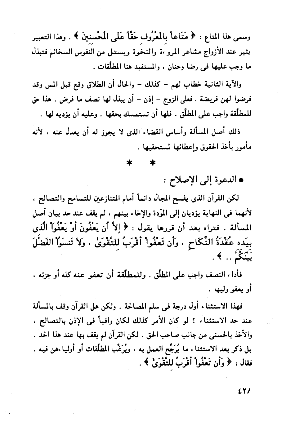المسألة. فتراه بعد أن قررها يقول: (إِلَّا أَنْ يَعْفُونَ أَوْ يَعْفُوَ الَّذِي بِيَدِهِ عُقْدَةُ النِّكَاحِ وَأَنْ تَعْفُوا أَقْرَبُ لِلتَّقْوَى وَلَا تَنْسَوُا الْفَضْلَ بَيْنَكُمْ. .) .