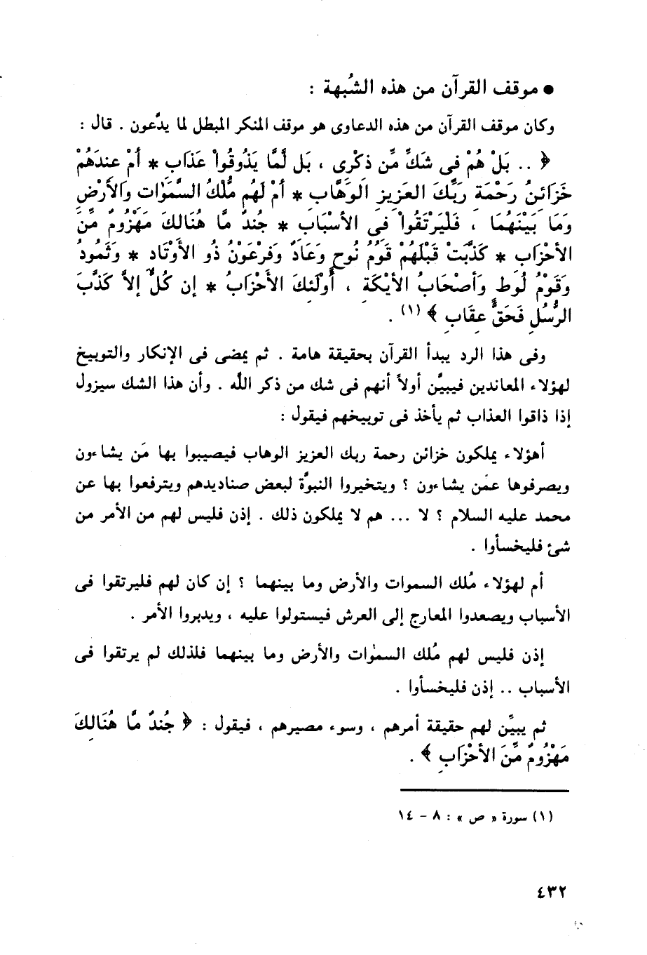 (. . بَلْ هُمْ فِي شَكٍّ مِنْ ذِكْرِي بَلْ لَمَّا يَذُوقُوا عَذَابِ (8) أَمْ عِنْدَهُمْ خَزَائِنُ رَحْمَةِ رَبِّكَ الْعَزِيزِ الْوَهَّابِ (9) أَمْ لَهُمْ مُلْكُ السَّمَاوَاتِ وَالْأَرْضِ وَمَا بَيْنَهُمَا فَلْيَرْتَقُوا فِي الْأَسْبَابِ (10) جُنْدٌ مَا هُنَالِكَ مَهْزُومٌ مِنَ الْأَحْزَابِ (11) كَذَّبَتْ قَبْلَهُمْ قَوْمُ نُوحٍ وَعَادٌ وَفِرْعَوْنُ ذُو الْأَوْتَادِ (12) وَثَمُودُ وَقَوْمُ لُوطٍ وَأَصْحَابُ الْأَيْكَةِ أُولَئِكَ الْأَحْزَابُ (13) إِنْ كُلٌّ إِلَّا كَذَّبَ الرُّسُلَ فَحَقَّ عِقَابِ (14) .