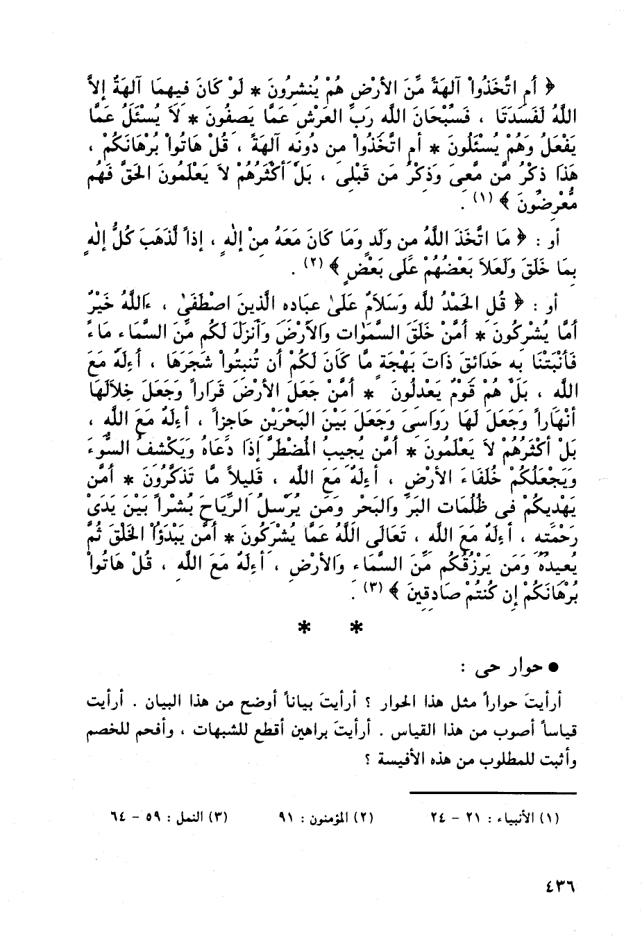 أو: (قُلِ الْحَمْدُ لِلَّهِ وَسَلَامٌ عَلَى عِبَادِهِ الَّذِينَ اصْطَفَى آللَّهُ خَيْرٌ أَمَّا يُشْرِكُونَ (59) أَمَّنْ خَلَقَ السَّمَاوَاتِ وَالْأَرْضَ وَأَنْزَلَ لَكُمْ مِنَ السَّمَاءِ مَاءً فَأَنْبَتْنَا بِهِ حَدَائِقَ ذَاتَ بَهْجَةٍ مَا كَانَ لَكُمْ أَنْ تُنْبِتُوا شَجَرَهَا أَإِلَهٌ مَعَ اللَّهِ بَلْ هُمْ قَوْمٌ يَعْدِلُونَ (60) أَمَّنْ جَعَلَ الْأَرْضَ قَرَارًا وَجَعَلَ خِلَالَهَا أَنْهَارًا وَجَعَلَ لَهَا رَوَاسِيَ وَجَعَلَ بَيْنَ الْبَحْرَيْنِ حَاجِزًا أَإِلَهٌ مَعَ اللَّهِ بَلْ أَكْثَرُهُمْ لَا يَعْلَمُونَ (61) أَمَّنْ يُجِيبُ الْمُضْطَرَّ إِذَا دَعَاهُ وَيَكْشِفُ السُّوءَ وَيَجْعَلُكُمْ خُلَفَاءَ الْأَرْضِ أَإِلَهٌ مَعَ اللَّهِ قَلِيلًا مَا تَذَكَّرُونَ (62) أَمَّنْ يَهْدِيكُمْ فِي ظُلُمَاتِ الْبَرِّ وَالْبَحْرِ وَمَنْ يُرْسِلُ الرِّيَاحَ بُشْرًا بَيْنَ يَدَيْ رَحْمَتِهِ أَإِلَهٌ مَعَ اللَّهِ تَعَالَى اللَّهُ عَمَّا يُشْرِكُونَ (63) أَمَّنْ يَبْدَأُ الْخَلْقَ ثُمَّ يُعِيدُهُ وَمَنْ يَرْزُقُكُمْ مِنَ السَّمَاءِ وَالْأَرْضِ أَإِلَهٌ مَعَ اللَّهِ قُلْ هَاتُوا بُرْهَانَكُمْ إِنْ كُنْتُمْ صَادِقِينَ (64) .